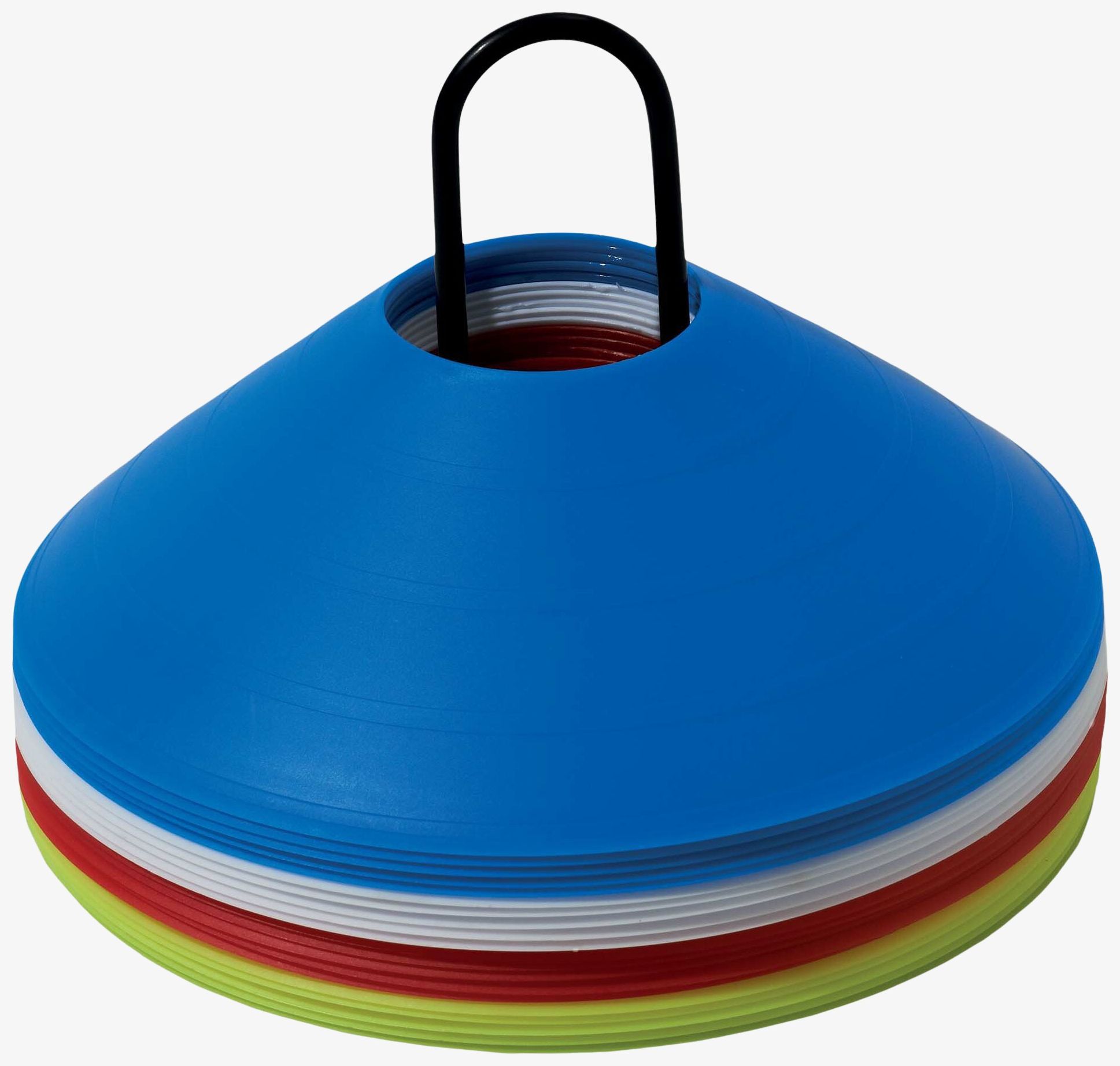 Kit de délimitation conique avec support de transport. Jeu de 20 coupelles (5 pièces x 4 coloris différents) de 5 cm de hauteur.
