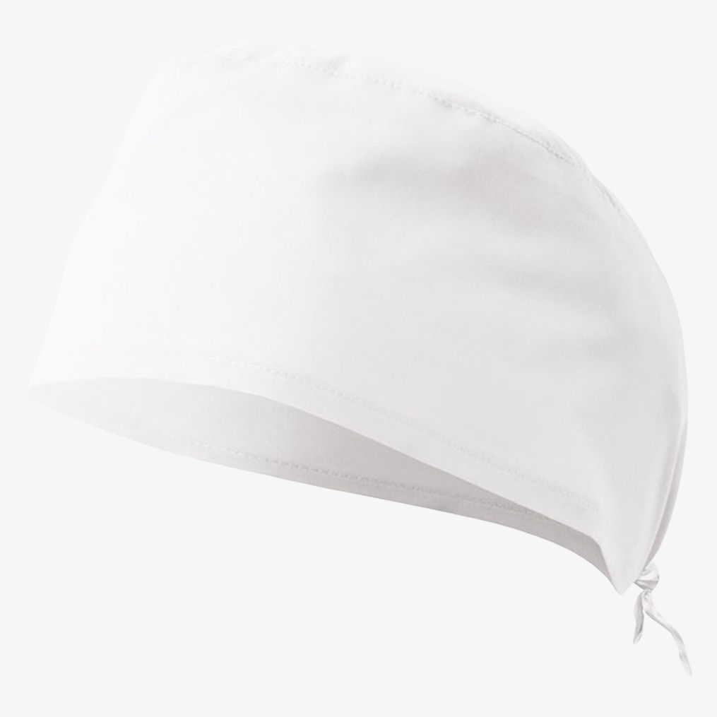 Le bonnet sanitaire comprend une partie élastiquée à l'arrière et un système d'ajustement par cordons pour un maintien modulable. Sa composition est de 65% polyester et 35% coton.