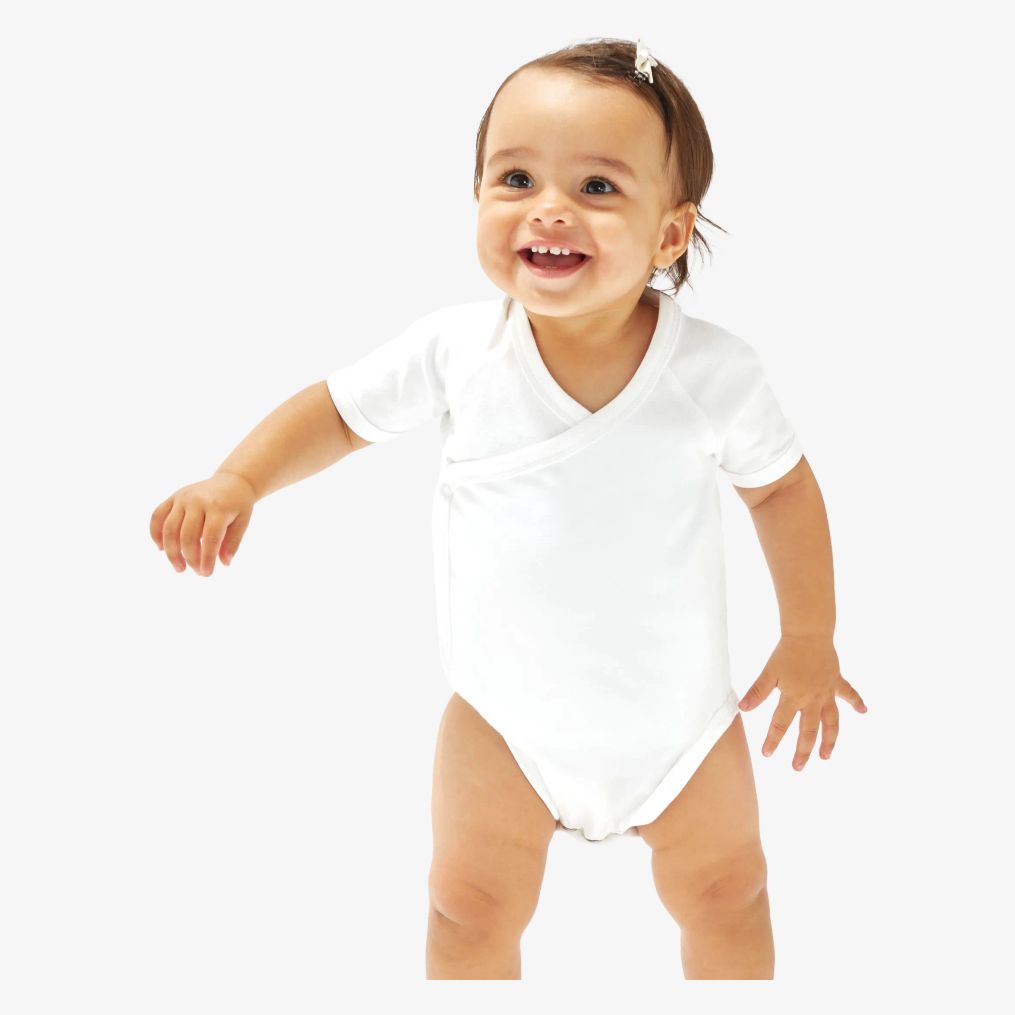 Le Organic Baby Kimono Bodysuit est un body bébé en coton peigné organique, en maille interlock. Ouverture type kimono et boutons-pression à l’avant au bas du vêtement pour faciliter l’habillage.
