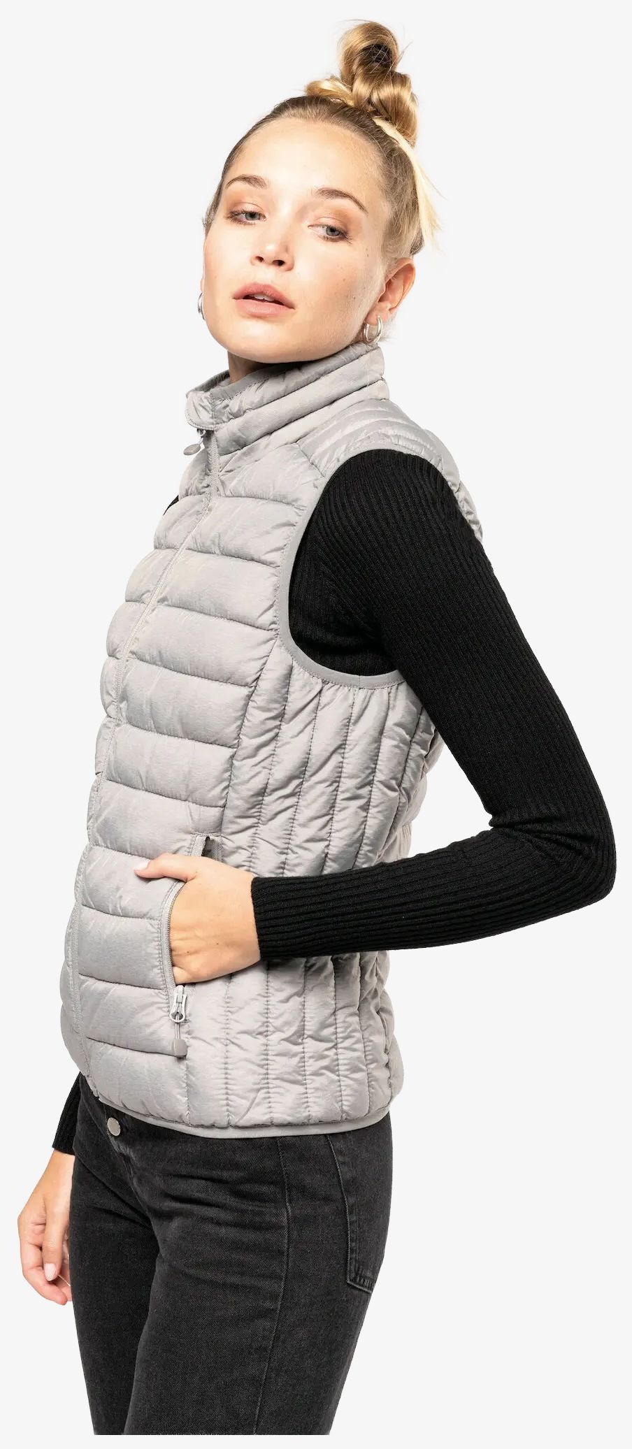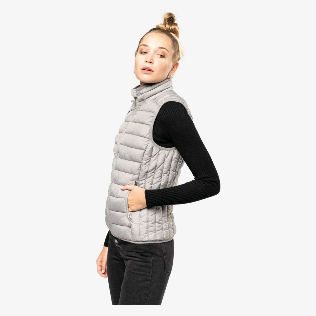 La doudoune légère sans manches offre un garnissage injecté avec un tissu majoritairement en polyamide. Elle est compressible et dotée de deux poches zippées à l'avant. L'intérieur présente différentes couleurs selon le coloris extérieur.