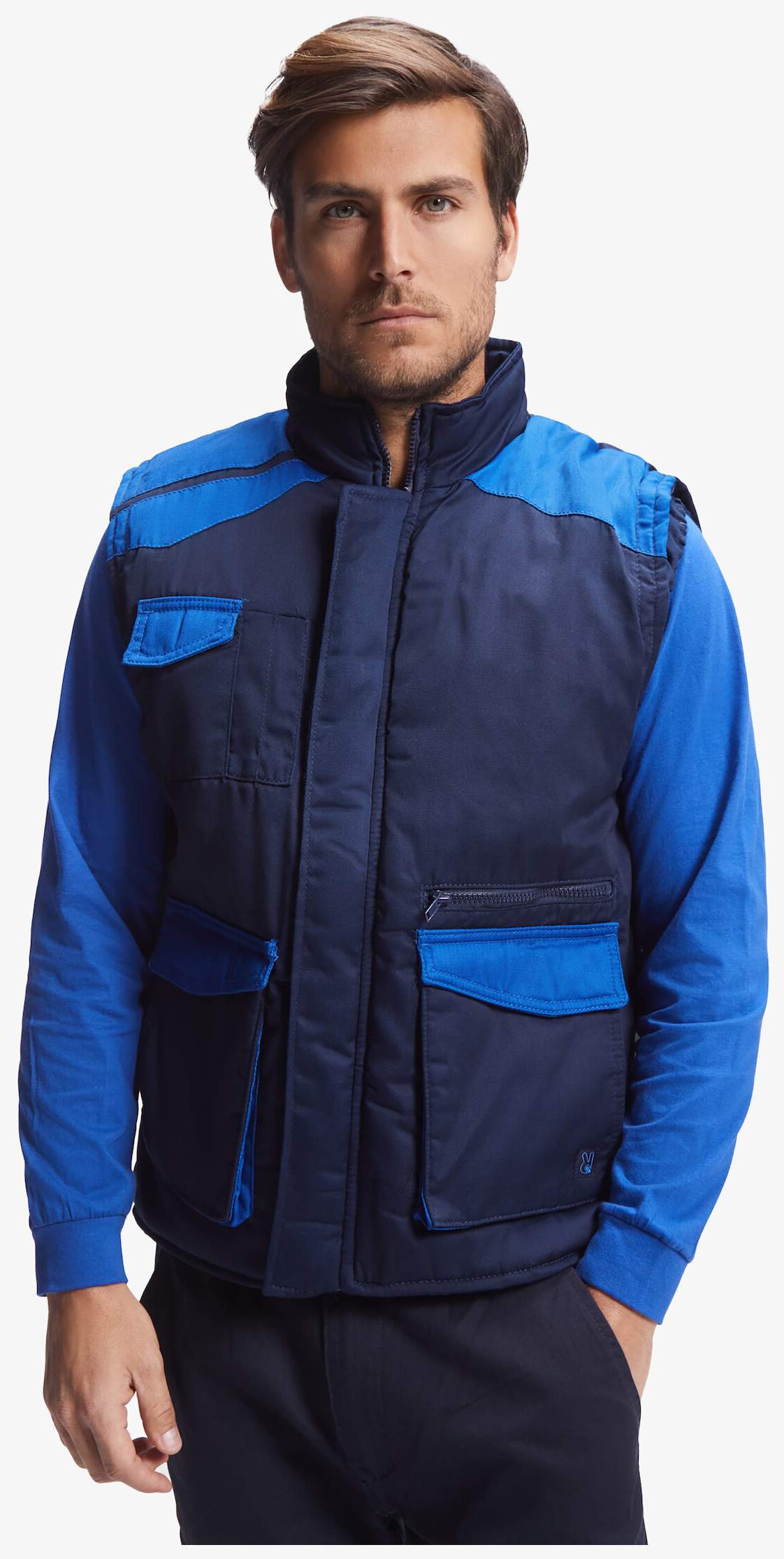Le gilet multi-poches avec col montant dispose d'un zip central et d'une fermeture par bande auto agrippante. Il comprend une poche extérieure pour portable, deux poches avant avec soufflet, deux emplacements pour stylos, une poche intérieure et une poche zippée. L'ourlet arrière est plus long et un ajusteur avec fermeture automatique est présent.