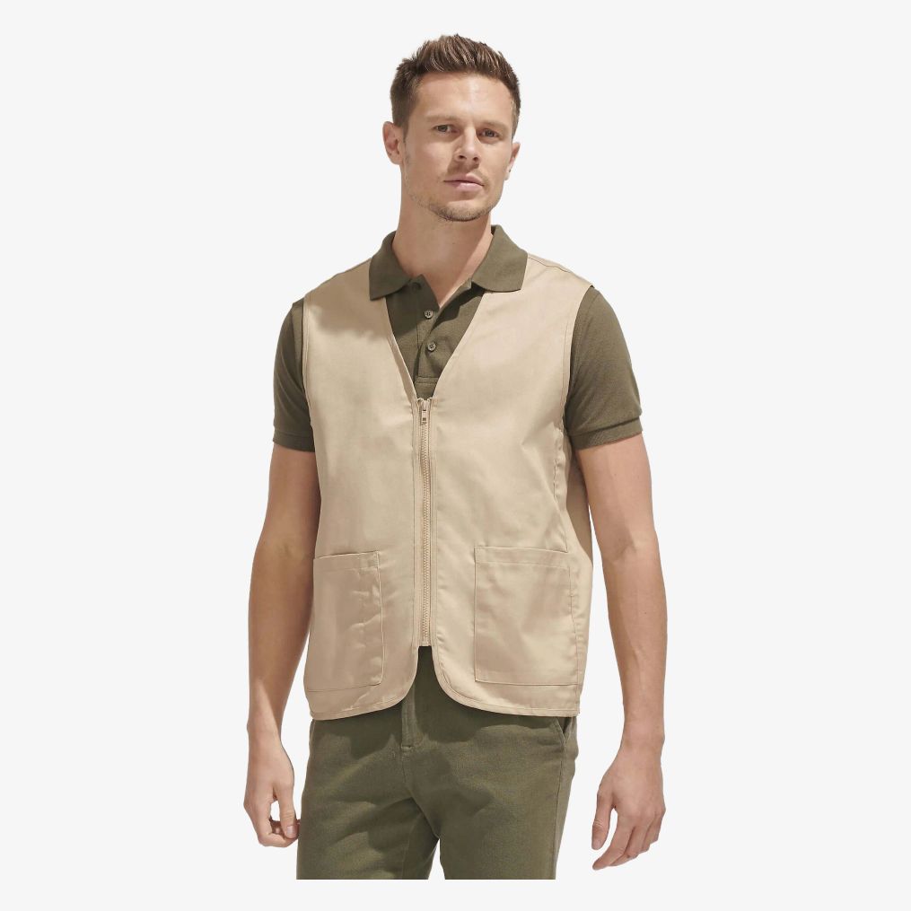 Le bodywarmer unisexe en twill est conçu avec un mélange de 65% polyester et 35% coton. Il dispose d'une ouverture zippée, de deux poches devant dont une avec compartiment stylo et d'une poche intérieure.
