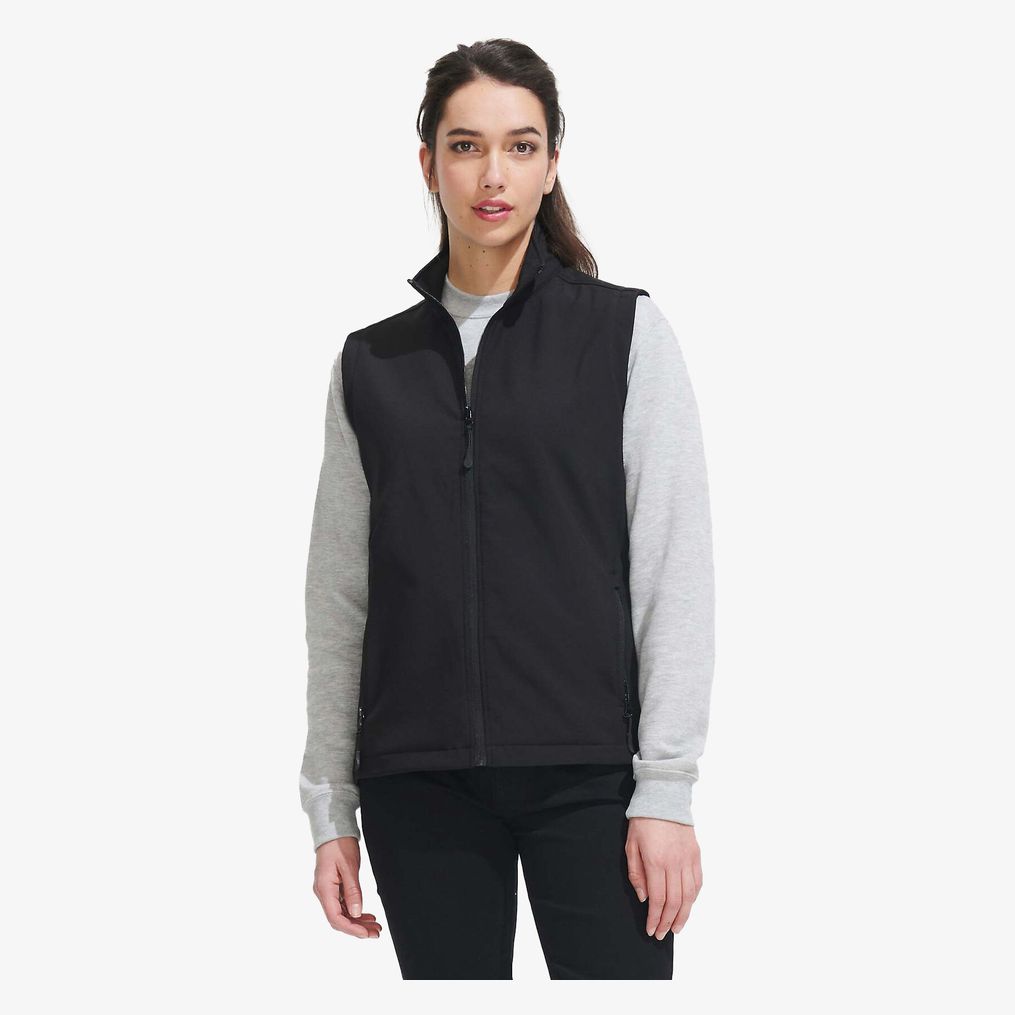 Le bodywarmer softshell femme Race BW Women 02888 comprend une composition en polyester et élasthanne avec intérieur polaire. Il est sans manches et dispose de deux poches zippées.