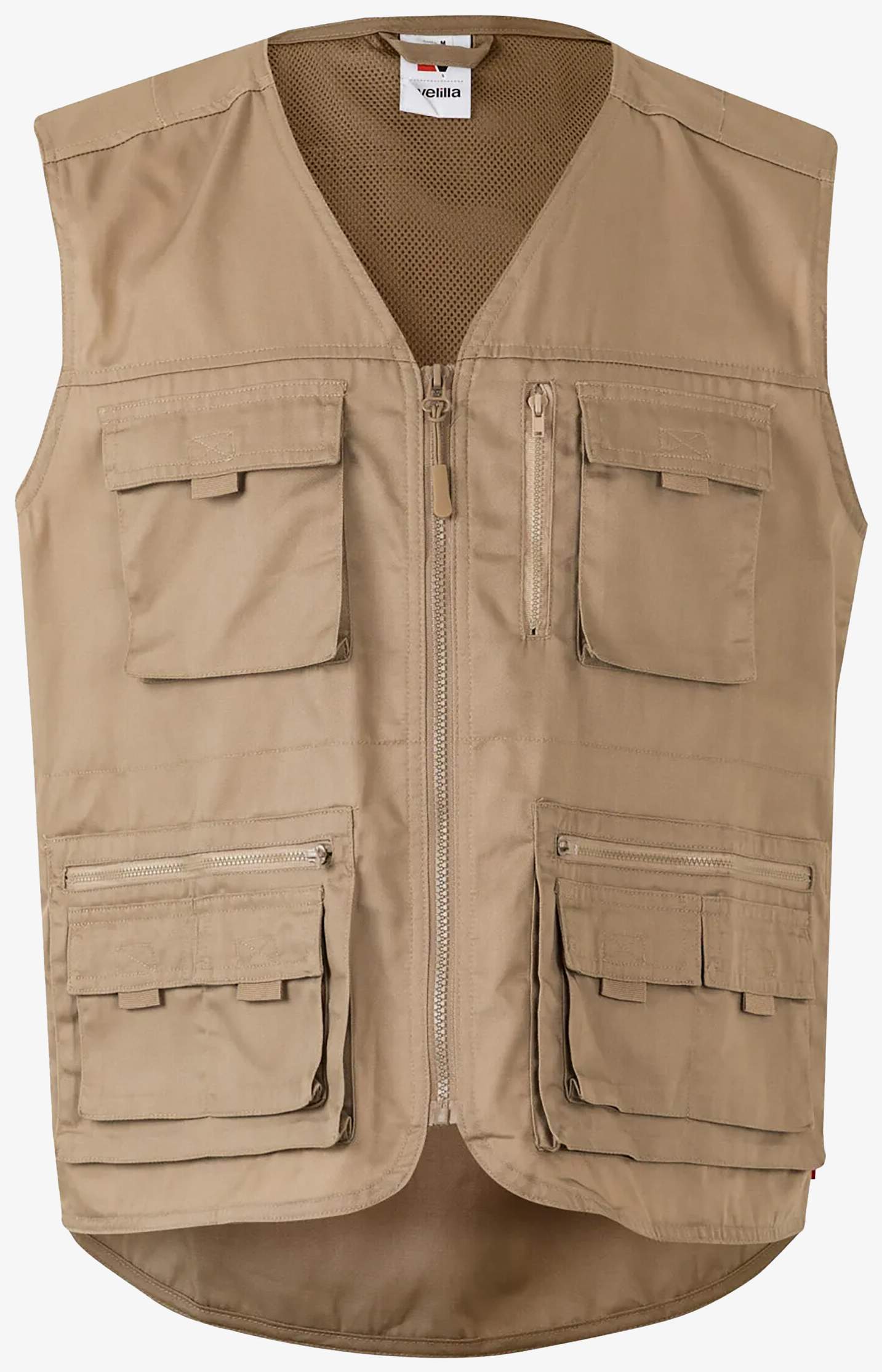 Le gilet multipoches sans manches dispose d'une fermeture zippée centrale et d'empiècements avant et arrière. L'intérieur est en toile. Il comporte neuf poches : deux poches poitrine avec rabat et bande auto-agrippante, une poche poitrine verticale zippée, deux poches frontales zippées avec rabat, ainsi que deux autres poches avec rabat et bande auto-agrippante.