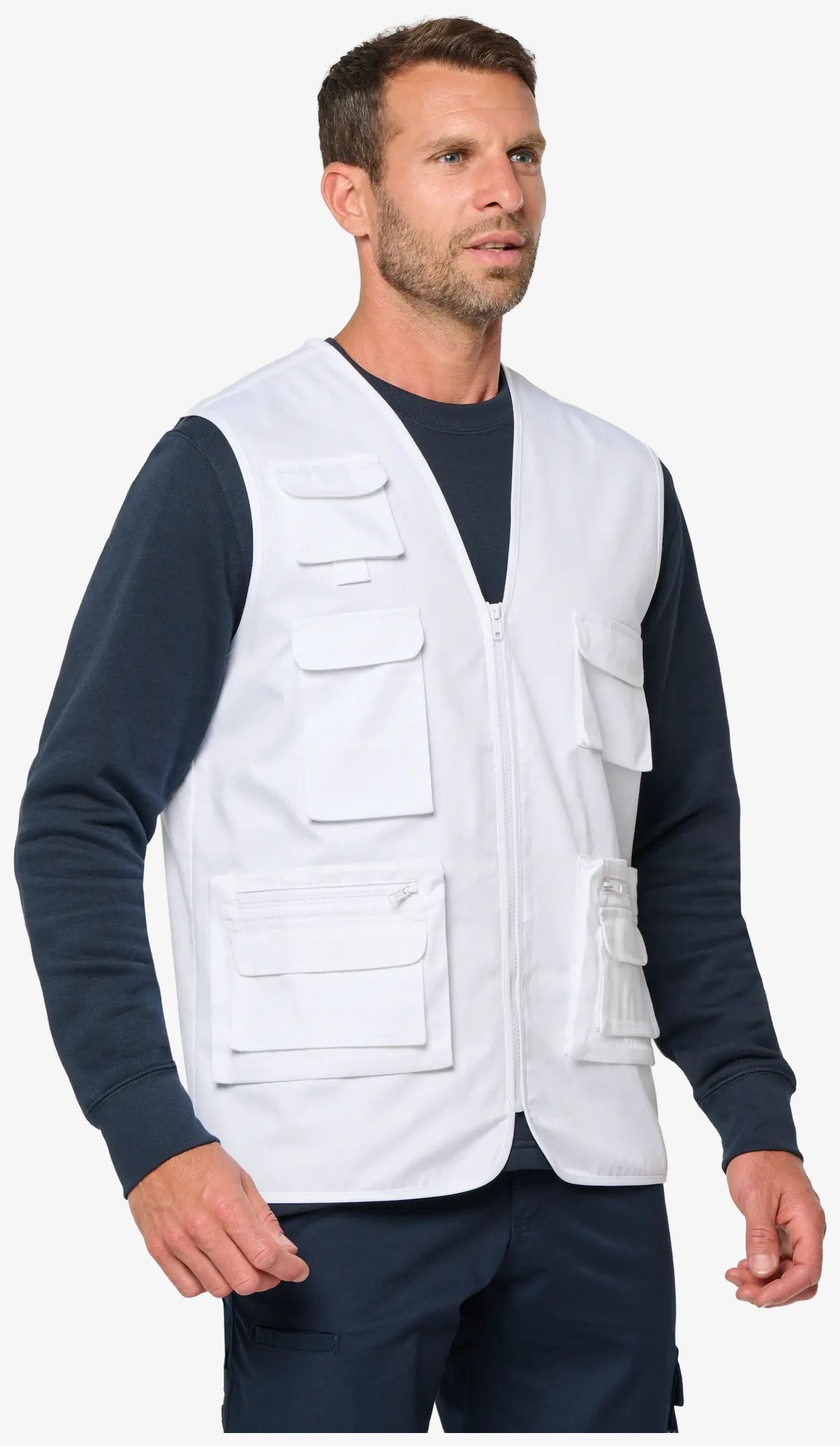 Le gilet polycoton doublé unisexe est conçu pour une utilisation pratique grâce à ses multiples poches et sa coupe ajustée. Il dispose d'une doublure en maille filet sur la moitié du dos et d'un dos légèrement rallongé. La fermeture s'effectue par un zip plastique ton sur ton.