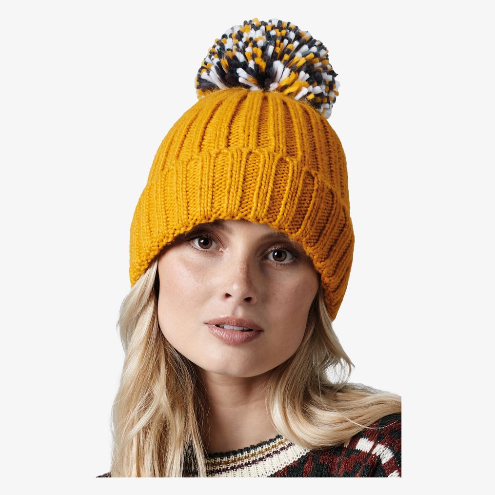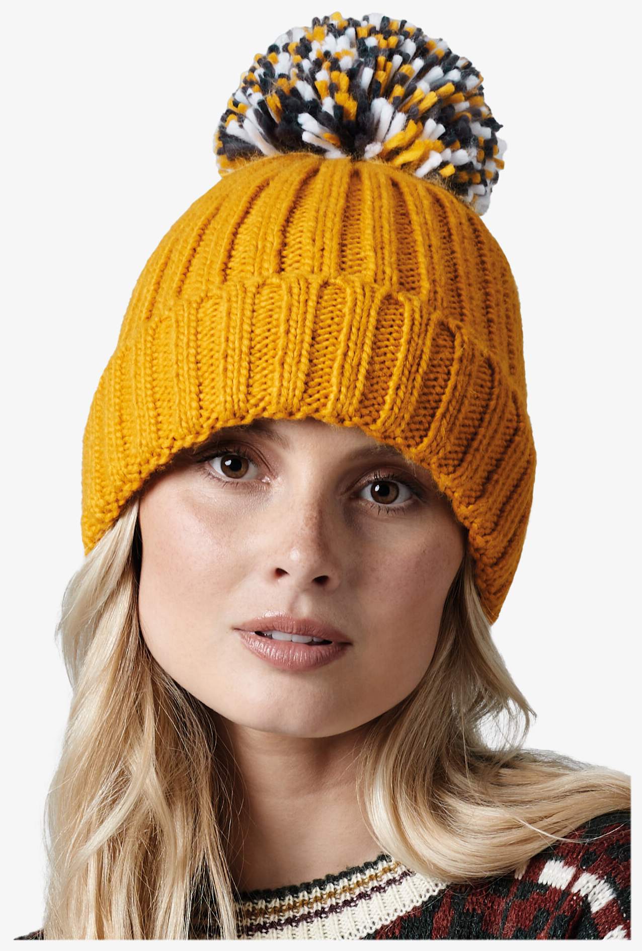 Le bonnet à maille côtelée épaisse dispose d'une doublure imitation mouton pour plus de chaleur. Il comprend un pompon surdimensionné et une conception à revers. L'étiquette est détachable.
