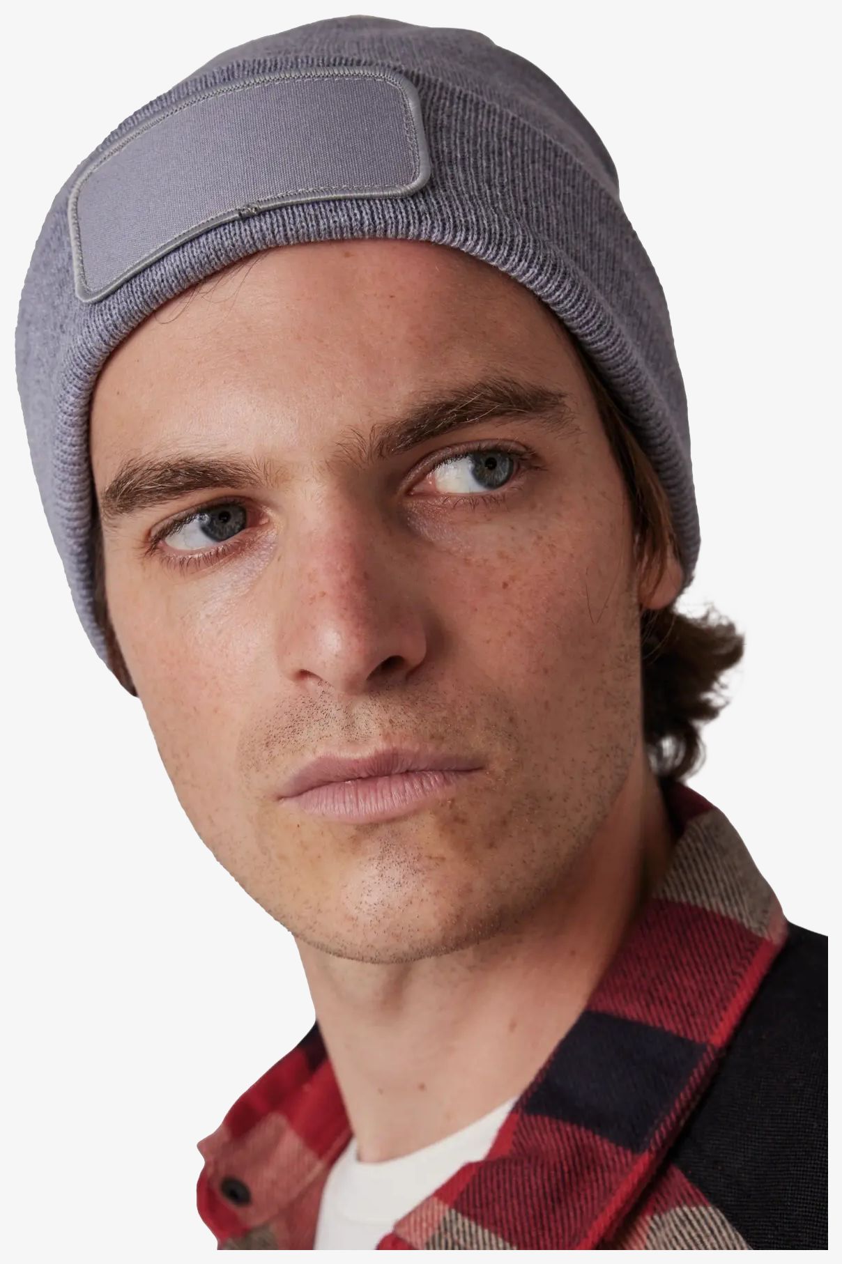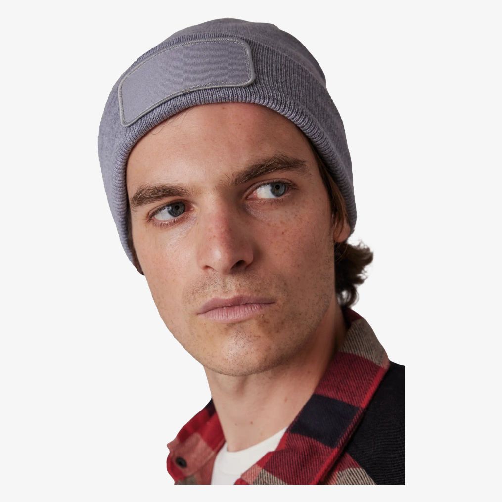Le bonnet recyclé est tricoté avec un large revers et un patch en coton sur le devant. Il combine polyester et acrylique issus de fibres recyclées pour une fabrication durable.