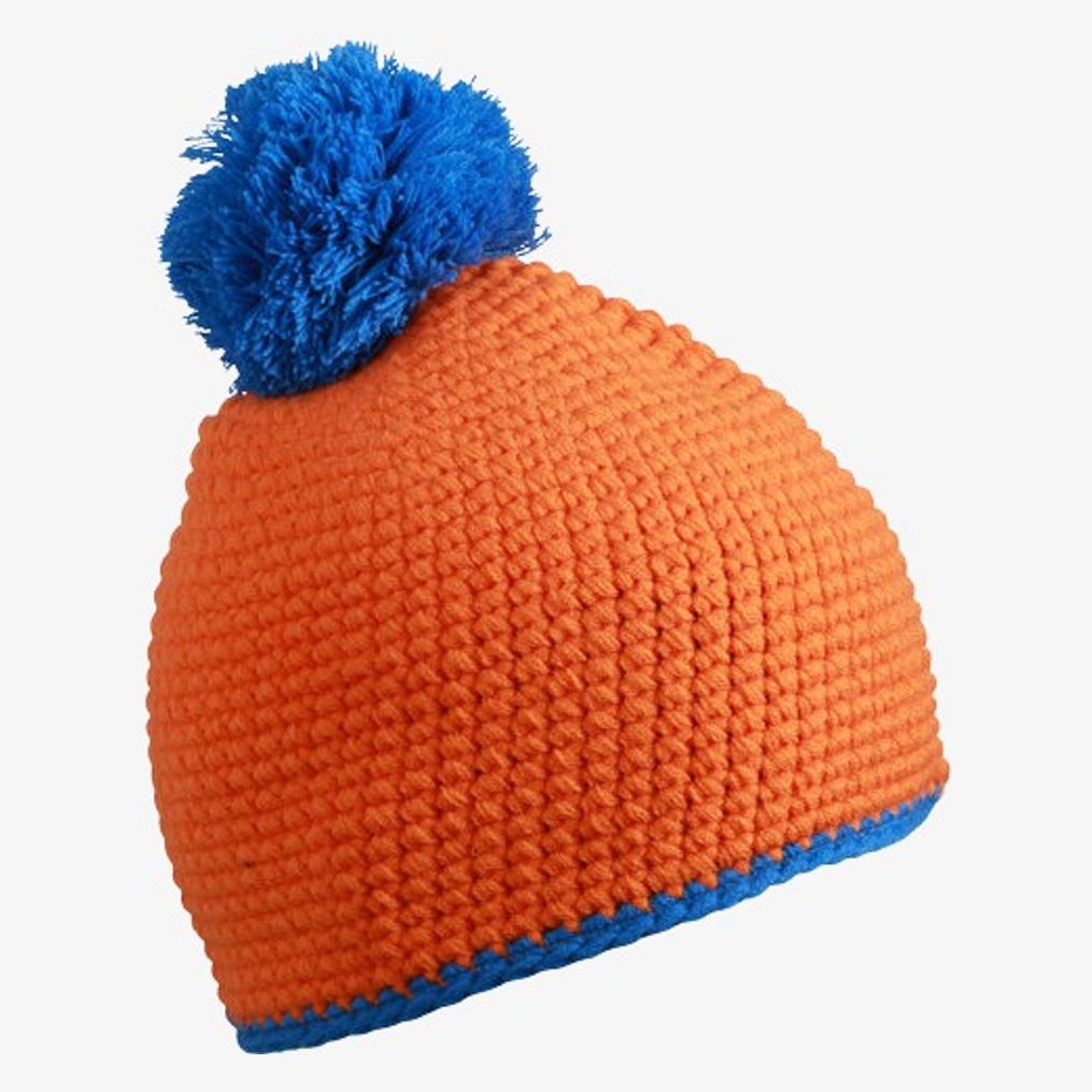Le bonnet acrylique avec pompon présente une structure contrastante et une bande intérieure non tissée pour le confort à l'usage. La fabrication est artisanale.