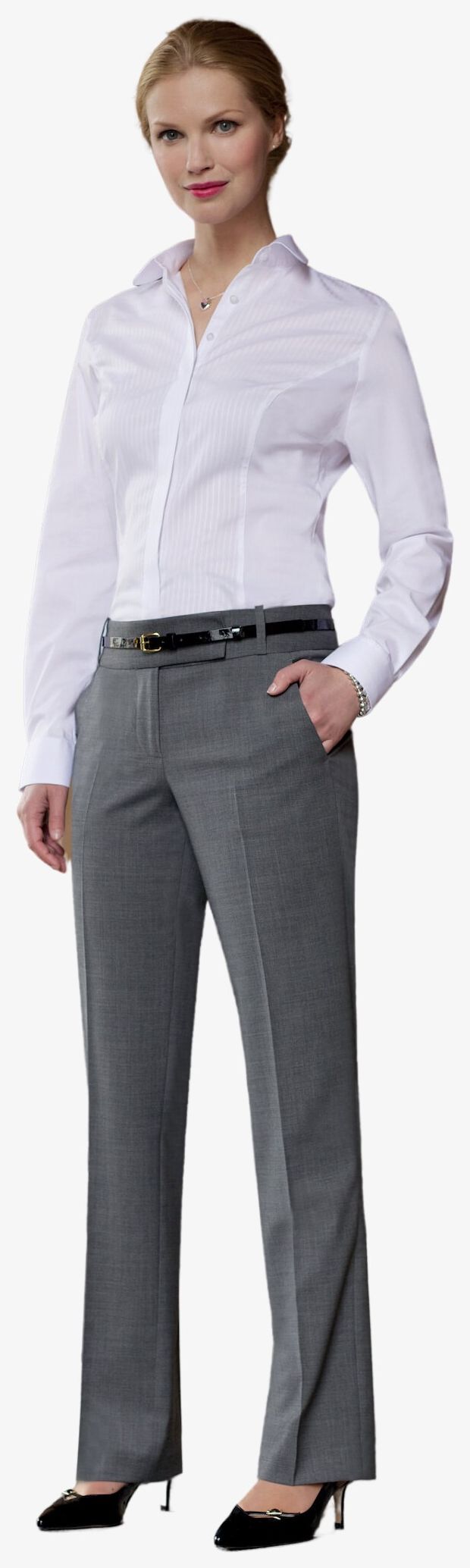 Pantalon, coupe slim, 2 poches latèrales, poche arrière, boucles de ceinture, Lavable en machine à 40°C ou nettoyage à sec. Composition: 54% Polyester / 44% Laine / 2% Elasthane.