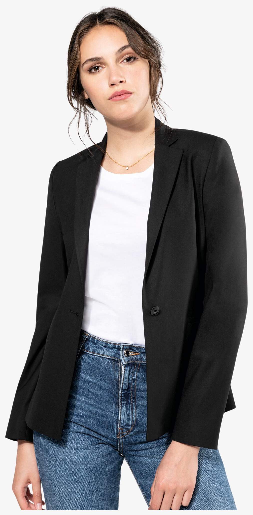 La veste blazer femme comprend une doublure 100% twill polyester ton sur ton avec plis d'aisance. Elle se ferme par un bouton et dispose de deux poches passepoilées devant ainsi qu'une poche intérieure côté cœur. Le bas des manches est orné de trois boutons et une fente d'aisance est présente au bas du dos.