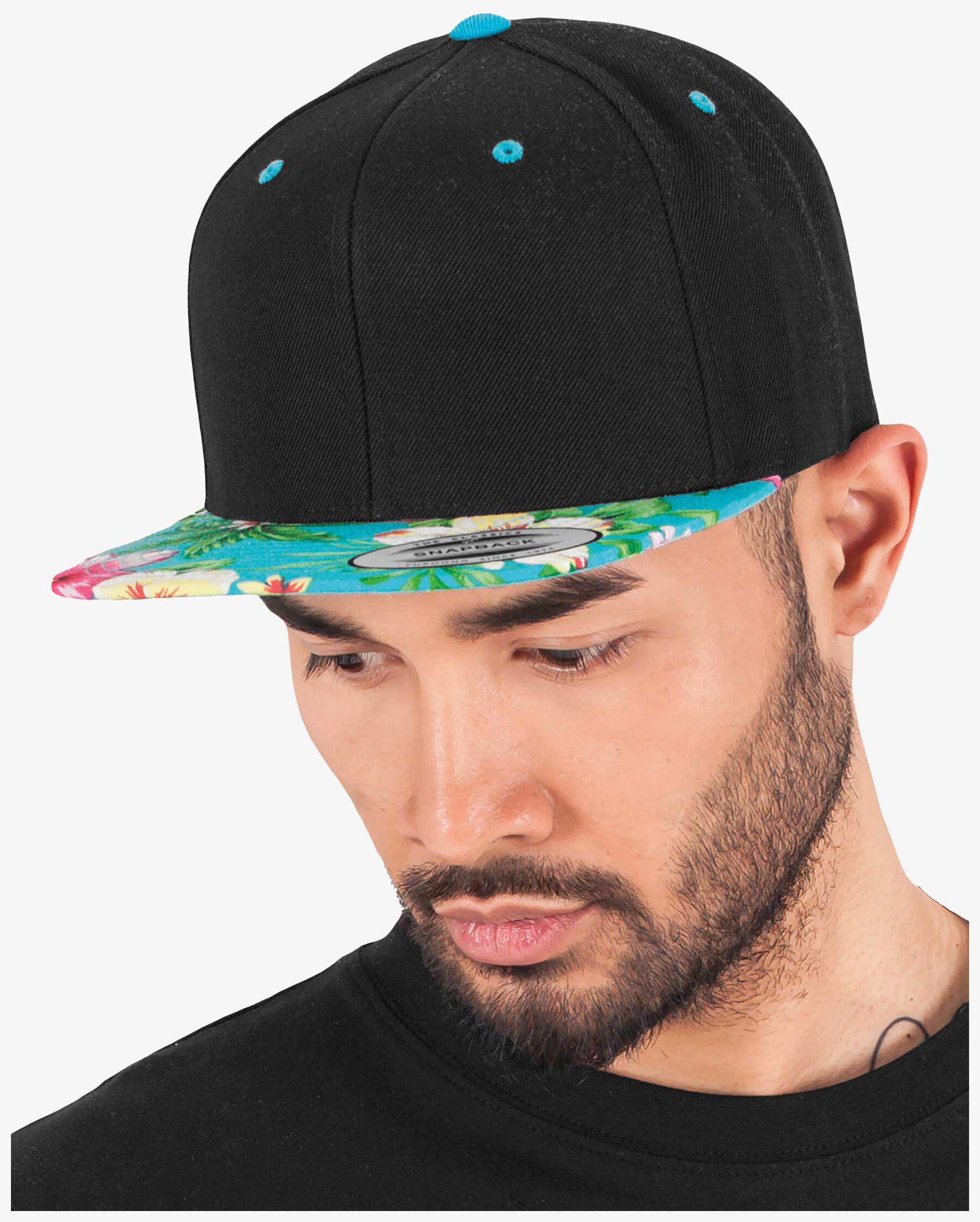 Casquette avec motifs hawaïen sur la visière. Forme classique. Mélange laine de qualité. Attache en plastique assortie. Bougran robuste.Fermeture snapback, visière plate, six pans. Composition : sergé 80 % acrylique, 20 % laine Grammage : 382g/m²