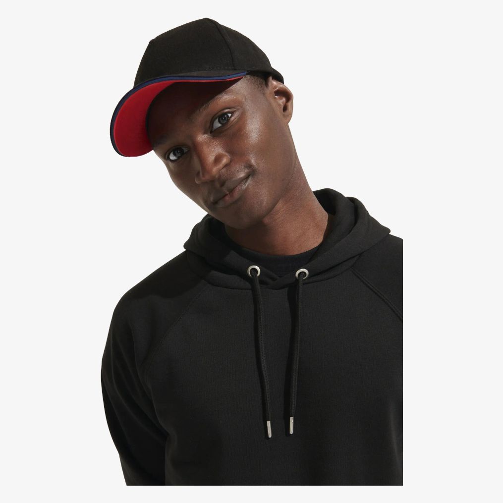 La casquette tricolore unisexe présente une forme 5 panneaux avec une patte de réglage à l'arrière par boucle métallique. Elle intègre quatre œillets brodés pour faciliter la ventilation.