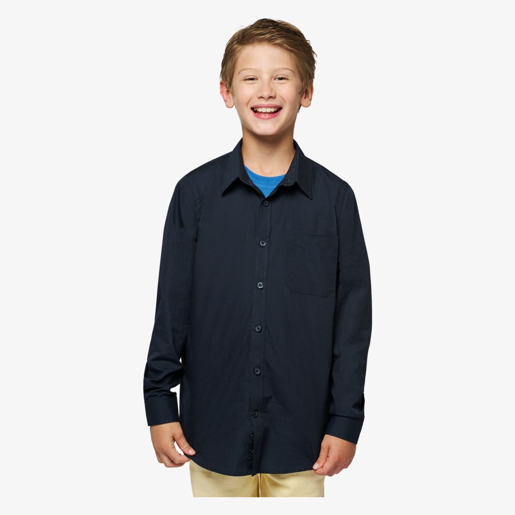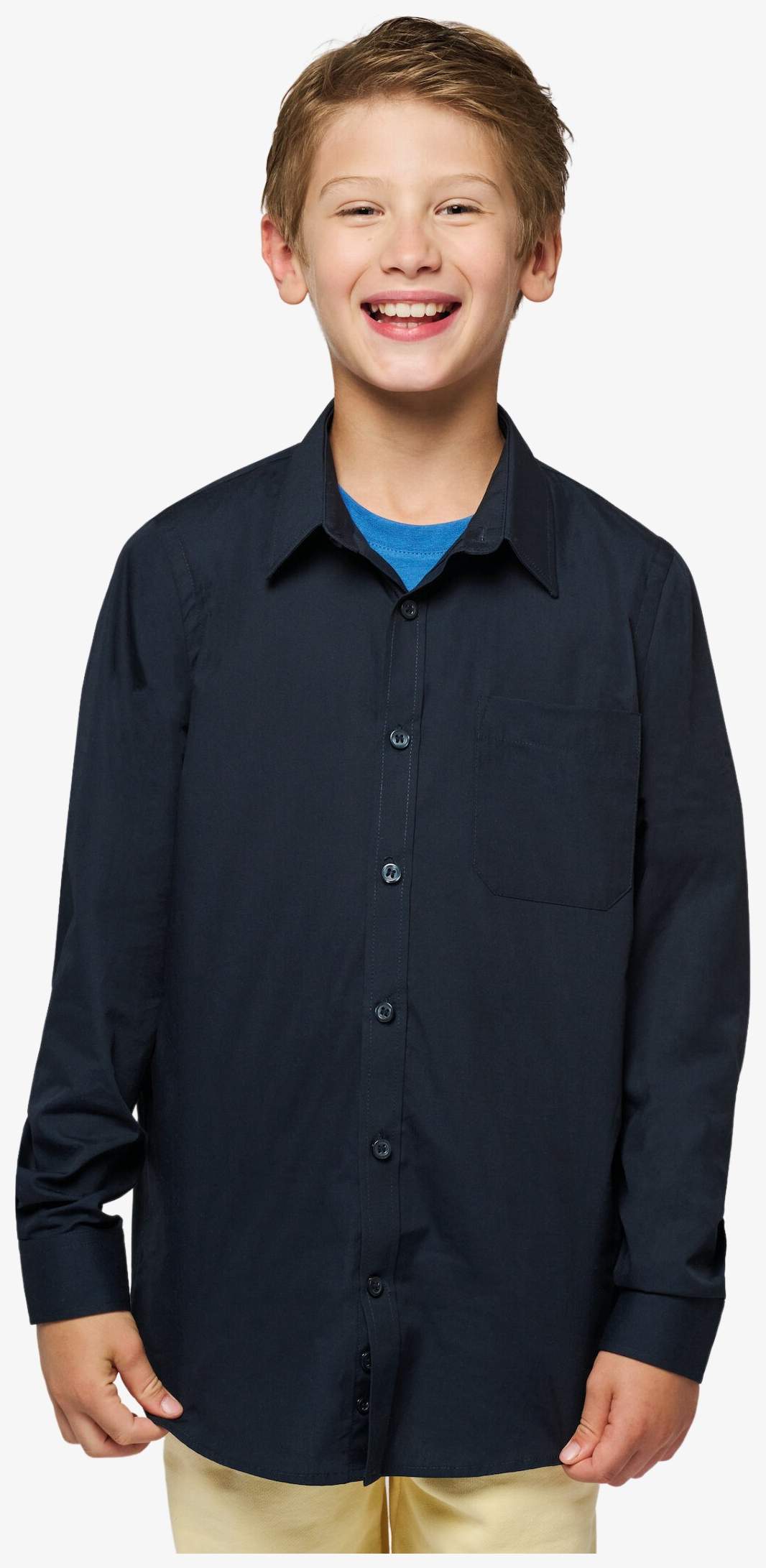 La chemise manches longues enfant en popeline est confectionnée en 100% coton avec un traitement Easy care. Elle possède un col baleiné, des boutons ton sur ton et une poche poitrine côté gauche à angles rabattus. L'empiècement dos est double et les coutures sont rabattues.