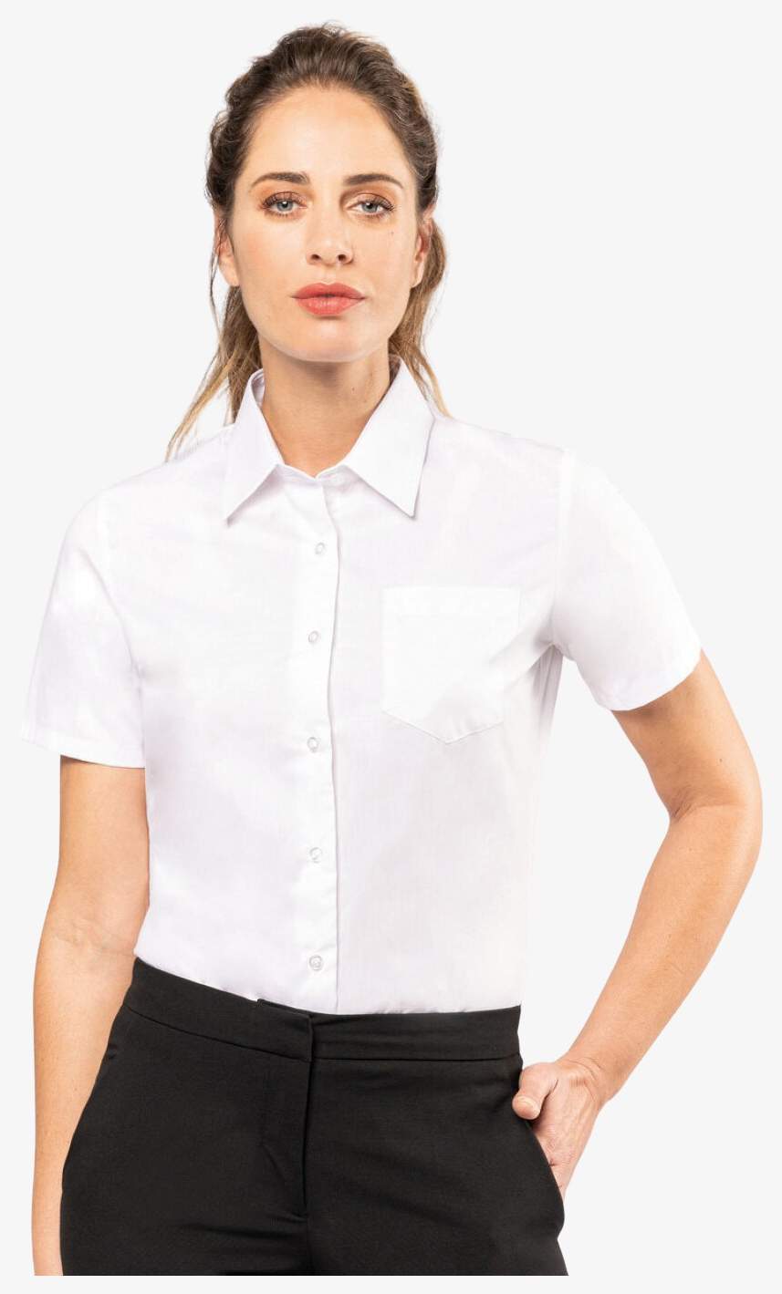 La Chemise popeline manches courtes femme k544 en coton popeline avec traitement Easy Care. Col non boutonné, boutons ton sur ton, poche poitrine côté gauche et bas arrondi.