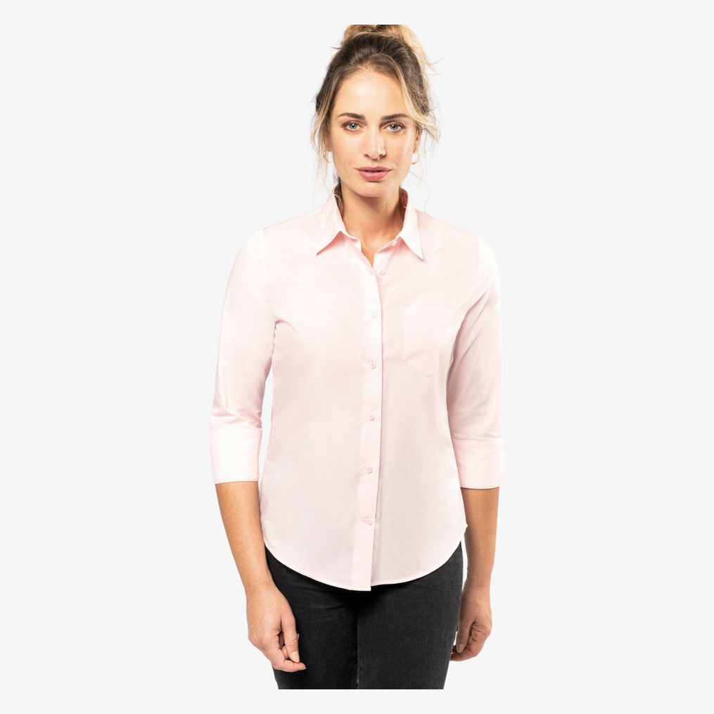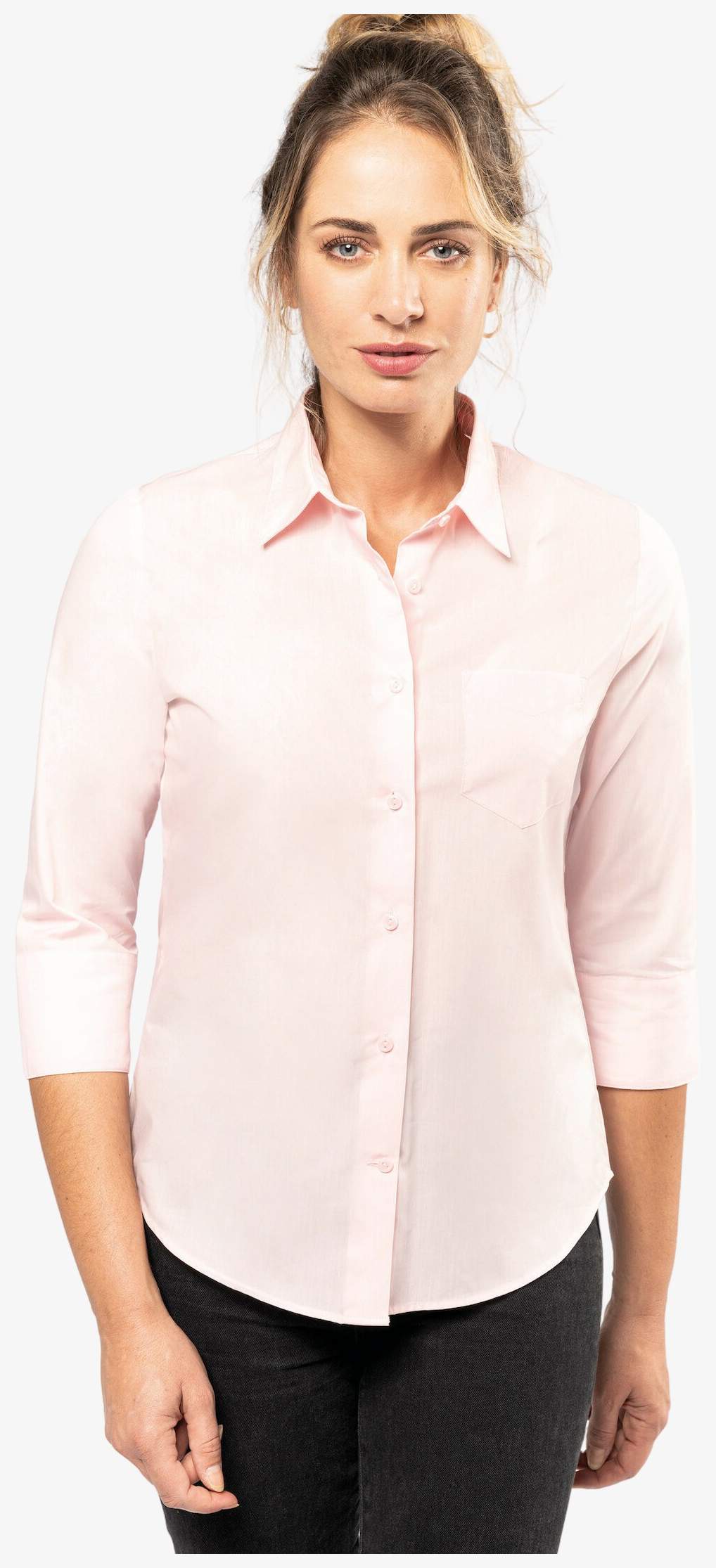 La chemise manches 3/4 femme combine 65% polyester et 35% coton en popeline pour un entretien facile. Elle présente un col non boutonné, des boutons ton sur ton et une poche poitrine côté gauche avec un bouton rappel. Le bas est arrondi.