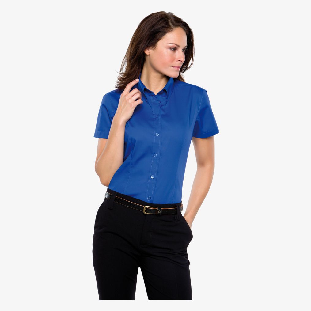 La Ladies Corporate Oxford Blouse chemise kk701 convient à un usage professionnel avec une coupe cintrée, des manches courtes, un col boutonné, un empiècement dos et un ourlet arrondi.