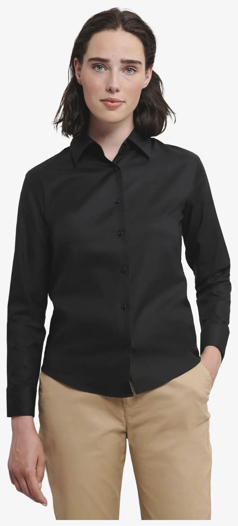 La chemise Oxford cintrée manches longues pour femme est conçue en mélange coton polyester offrant une gestion facile. Elle comporte 2 boutons au col, des pinces devant et dos pour un ajustement cintré, ainsi qu'une base mi-arrondie avec boutons réserve. Les manchettes arrondies sont réglables avec boutons.