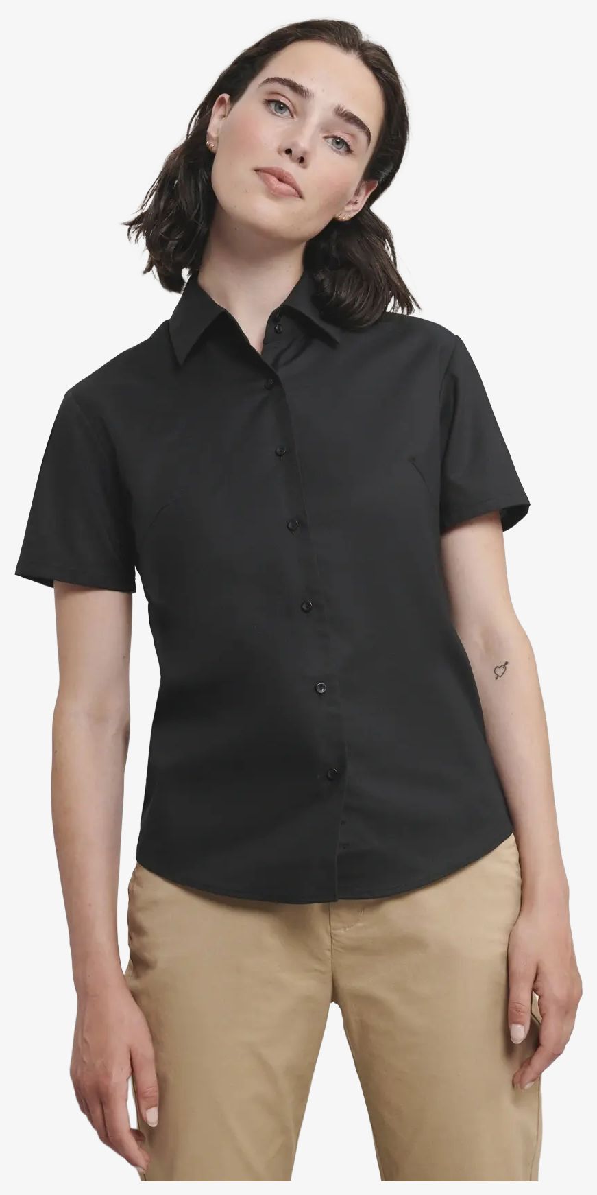 La chemise Oxford manches courtes pour femme associe 70% coton et 30% polyester. Elle présente une base mi-arrondie et des boutons réserve. Deux boutons ornent le col. Pinces devant et au dos assurent une coupe cintrée.