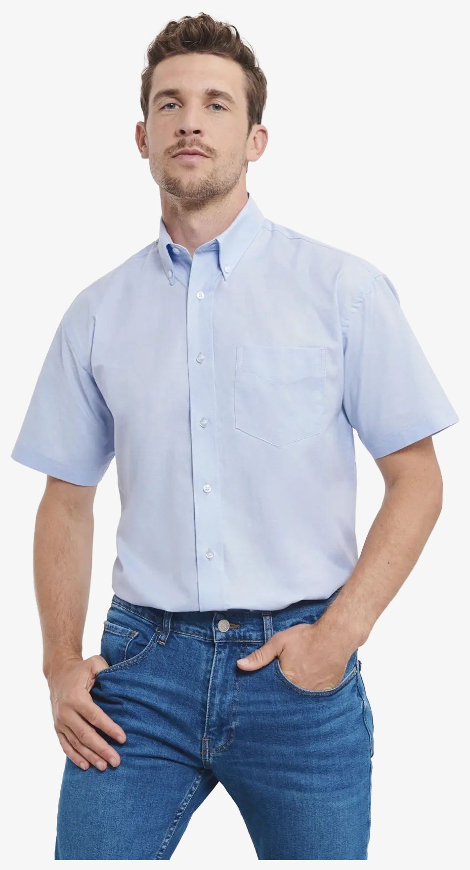 La chemise manches courtes pour homme comprend une poche poitrine en forme de V et un col à pointes boutonnées. Elle présente un empiècement aux épaules avec un pli au creux du dos, une coupe classique et une base arrondie avec boutons réserve.