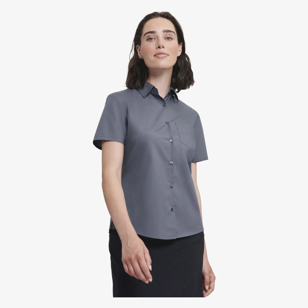 La chemise popeline polyester-coton manches courtes pour femme présente une coupe classique avec poche poitrine, col à bouton unique et boutons ton sur ton. Sa base est légèrement arrondie.