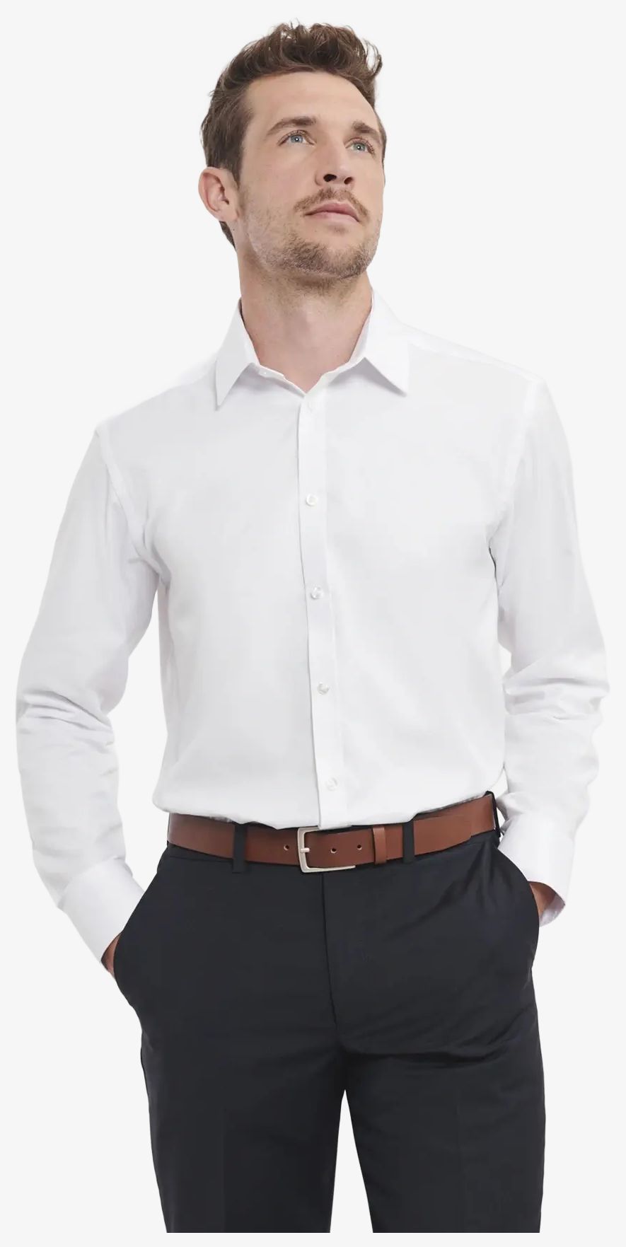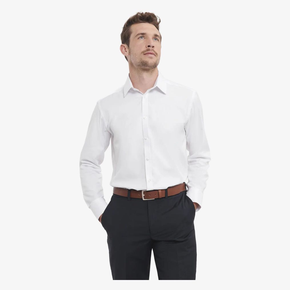 La chemise à chevrons cintrée manches longues associe un tissu composé de coton et polyester en mini chevron. Elle dispose d'un col semi-évasé, d'un rabat court, d'une patte de boutonnage étroite et de manchettes arrondies. La coupe est cintrée pour un ajustement précis.