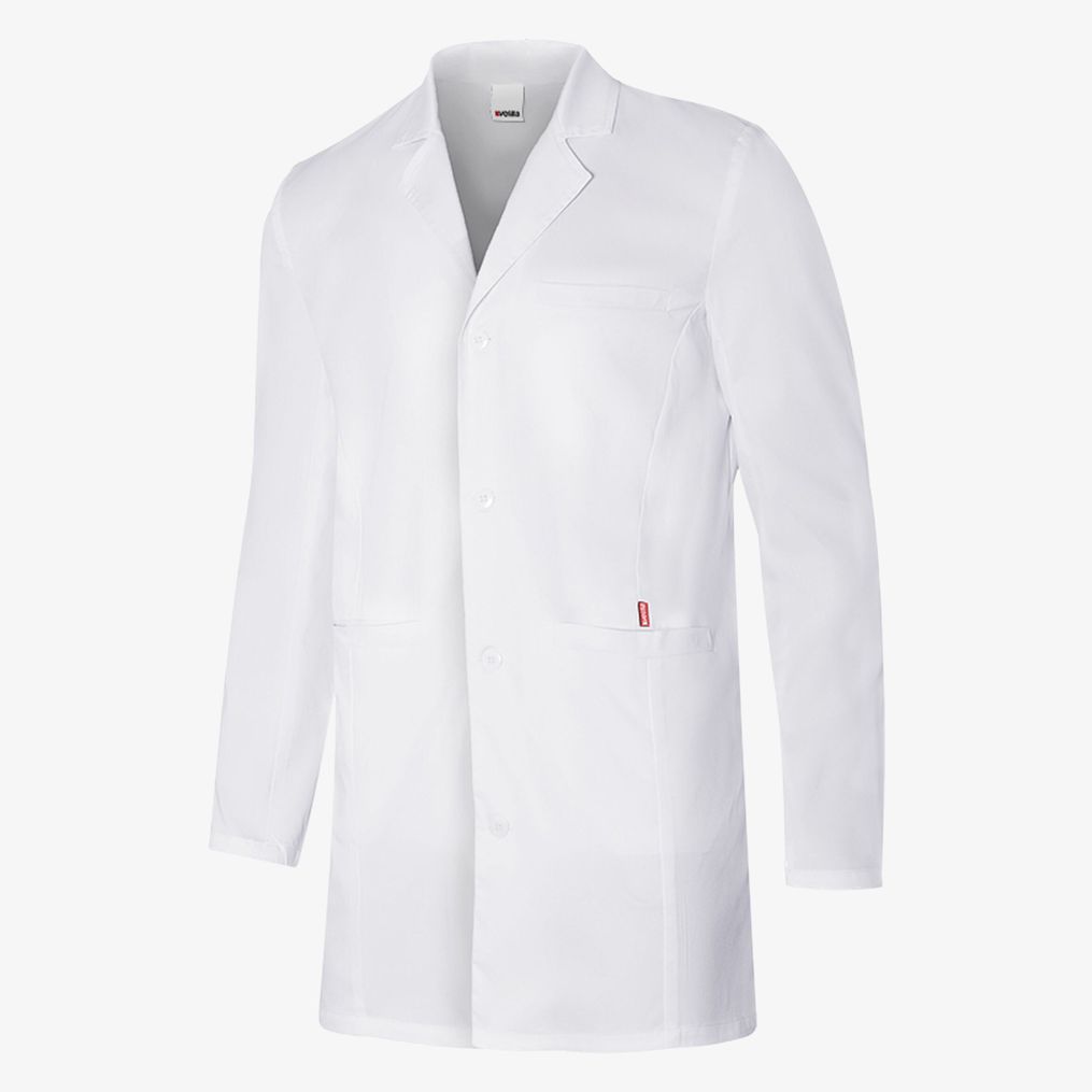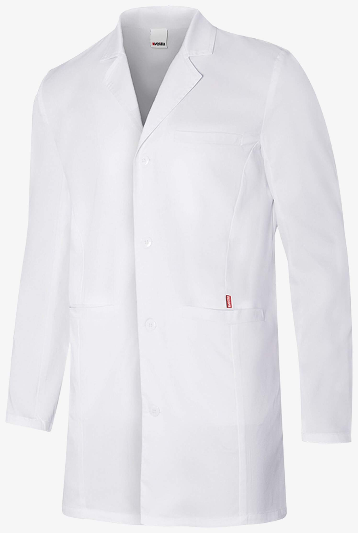 La blouse homme courte est conçue en polyester avec une fermeture par boutons et des manches type tailleur. Elle présente une ouverture dans le dos et une coupe semi-cintrée avec pinces pour une meilleure adaptation à la silhouette.