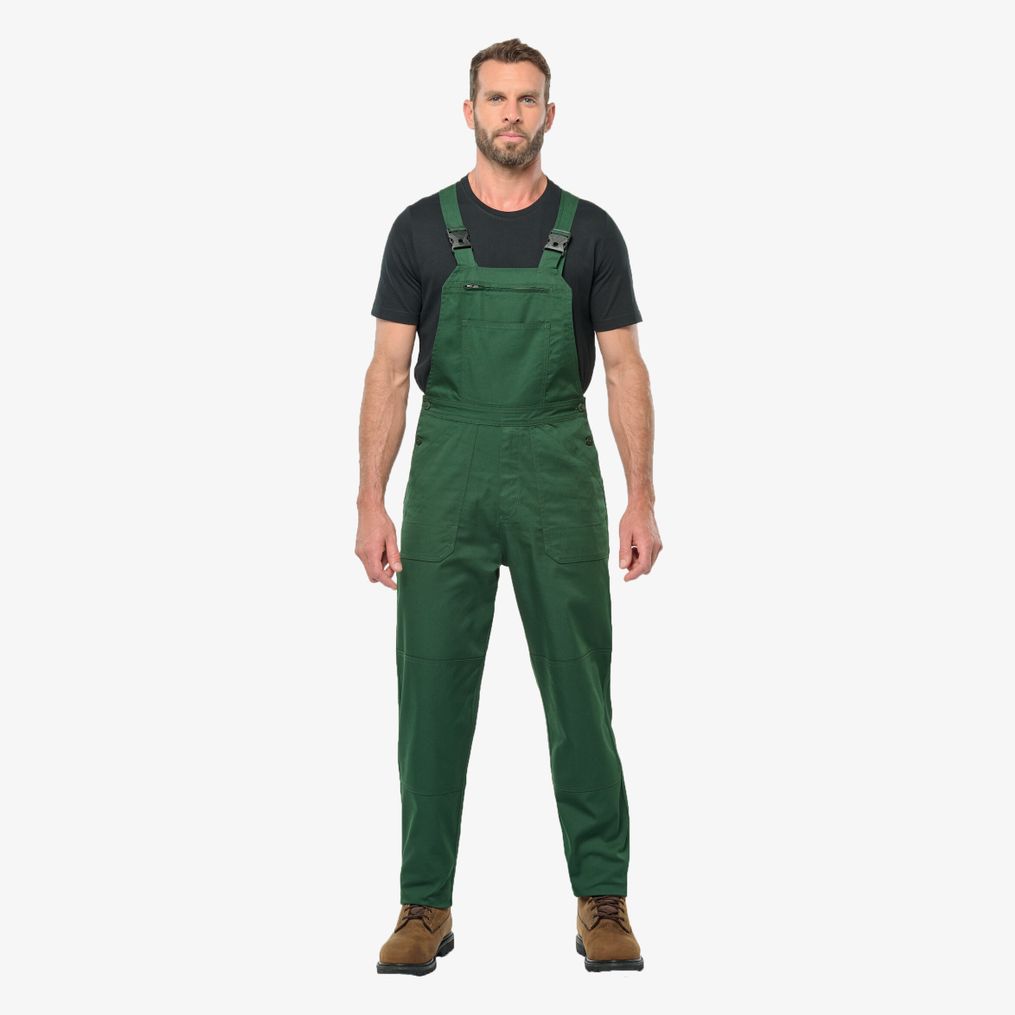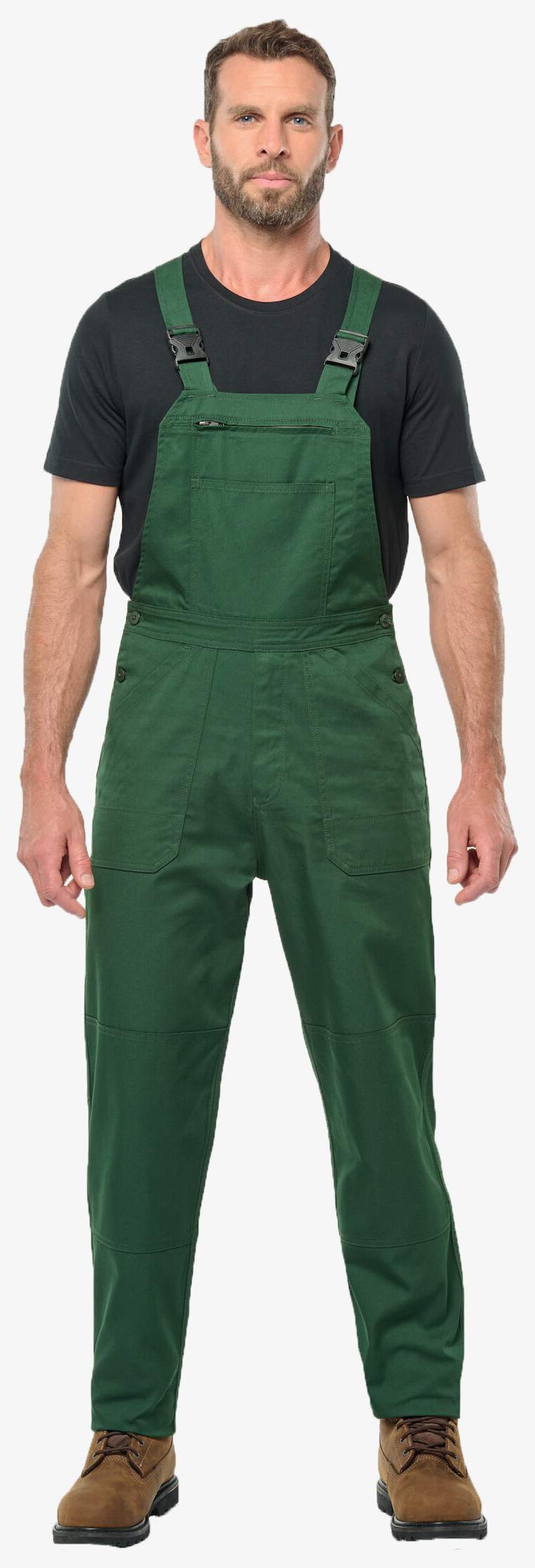 La salopette travail unisexe est conçue en tissu sergé. Elle comprend cinq poches avant dont deux plaquées, une grande poche frontale zippée avec une poche stylo intégrée, et une poche plaquée arrière. Les bretelles sont réglables grâce à une boucle plastique. Un large élastique au dos facilite la liberté de mouvement. La braguette est équipée d'une fermeture à glissière. L'ouverture latérale se ferme par patte à double boutonnage. Une étiquette nom est présente à l'intérieur. Les coutures sont renforcées ainsi que les genoux. Un lien d'accrochage est ajouté.