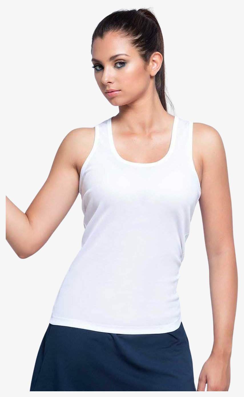 Débardeur de sport femme Aruba. Dos nageur. Étiquette amovible. Coupe ajustée. Composition : 100% polyester Grammage : 130g/m²