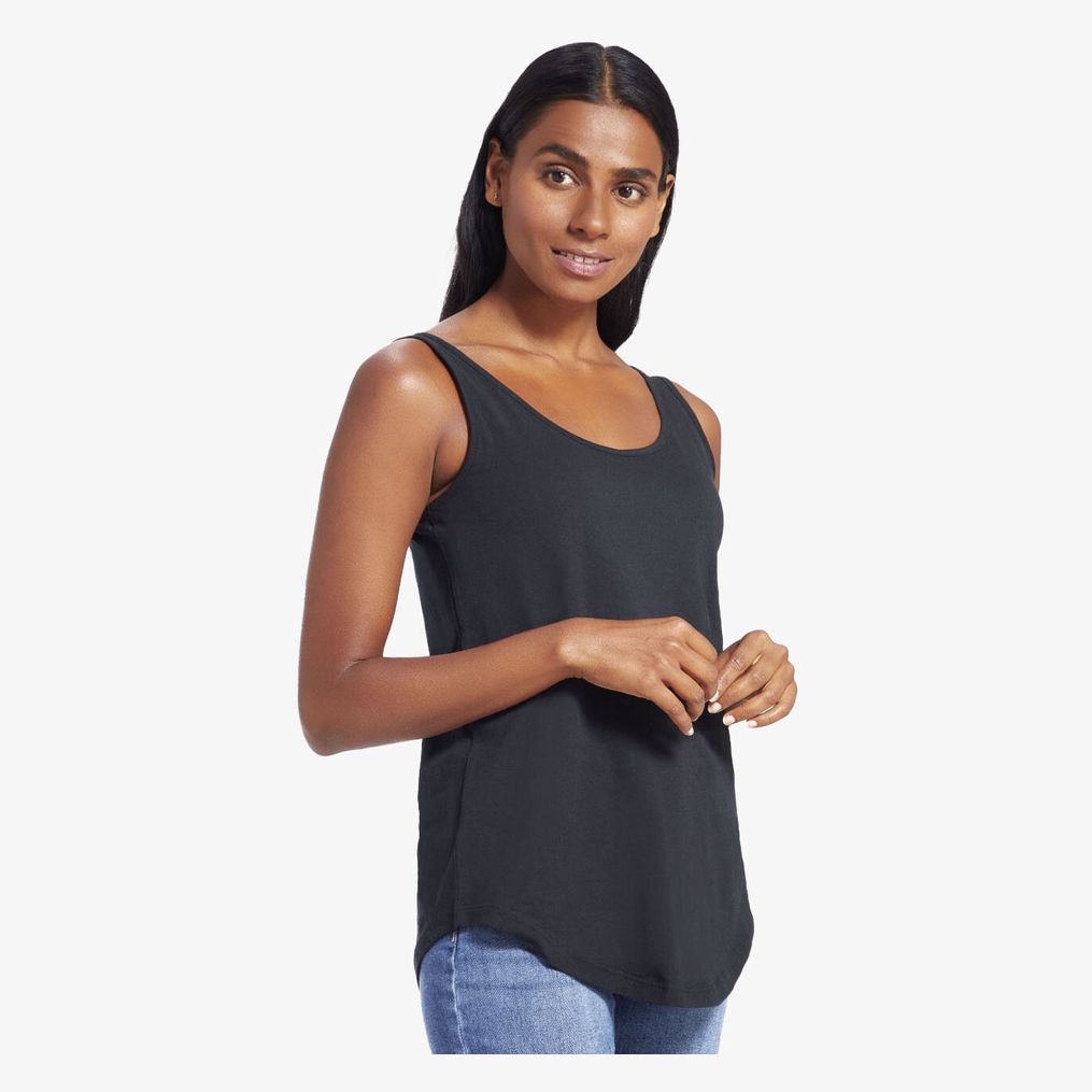 Le débardeur unicolore pour femme est conçu en coton bio ou conversion, ringspun peigné avec un jersey simple. Il possède un col rond, une coupe ajustée, un ourlet arrondi et des emmanchures étroites. Les coutures sont doubles et l'étiquette détachable est placée dans le cou.