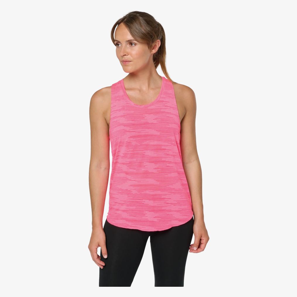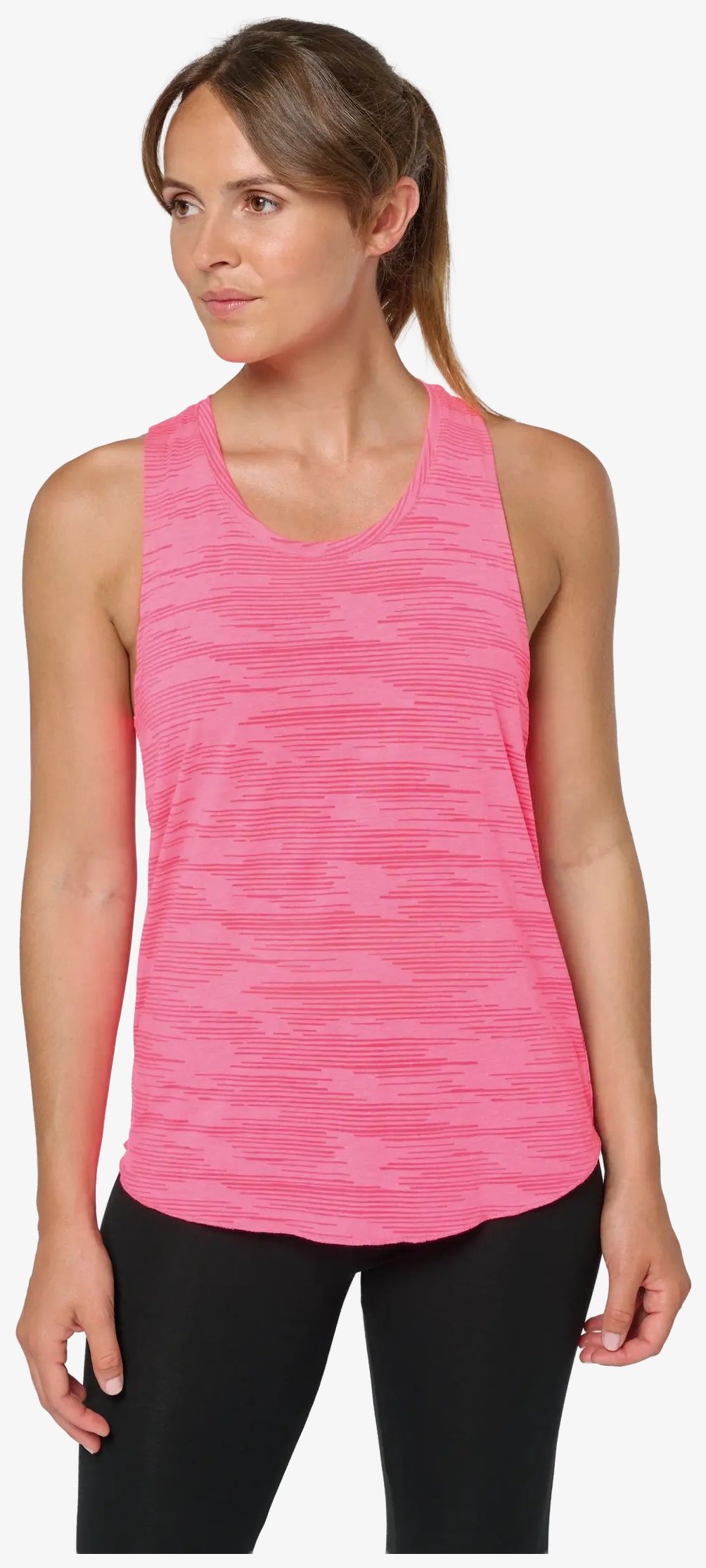 Le débardeur sport femme est conçu en maille jersey fluide à effet flammé. Il présente une coupe ample avec grandes emmanchures dos nageur, une encolure ronde avec bande propreté et un bas légèrement arrondi.