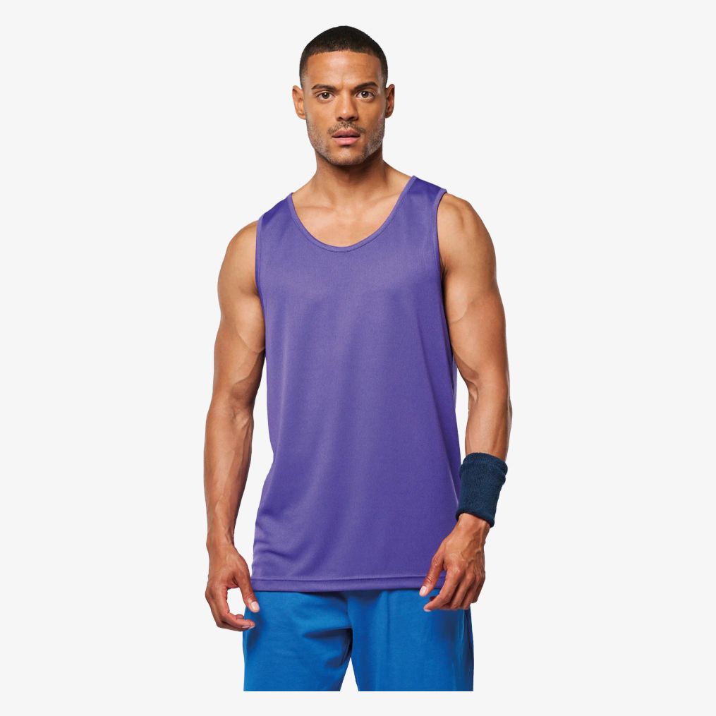 Le débardeur sport homme en polyester léger est fabriqué en tissu à séchage rapide avec un biais à l'encolure et aux emmanchures pour une meilleure tenue. La finition double aiguille au bas assure une confection soignée.