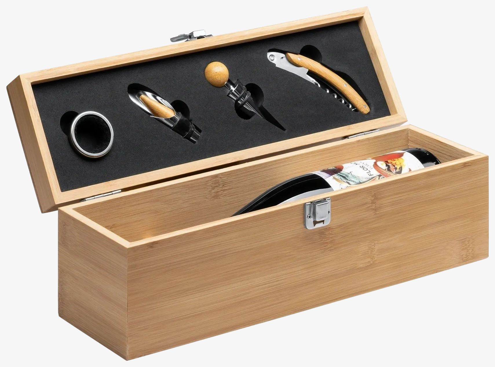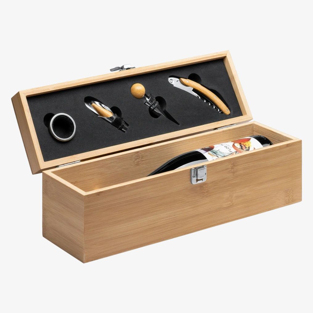 Le coffret bois bambou comprend un ensemble d'accessoires en acier inoxydable pour bouteille vin dans un couvercle dédié. L'intérieur rembourré assure la stabilité et la protection de la bouteille pendant le transport. Le bois offre une protection contre les chocs et les variations de température.