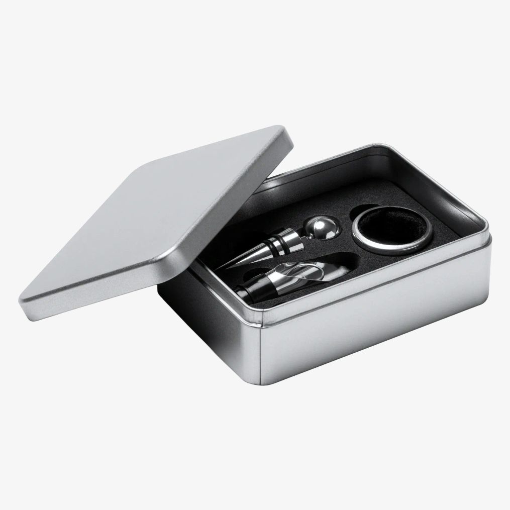 Le MALBEC est un décapsuleur en acier inoxydable associé à plusieurs accessoires pour la manipulation du vin. Il comprend un tire-bouchon à tirette avec lame rabattable, un anneau anti-goutte et un bouchon bec verseur.