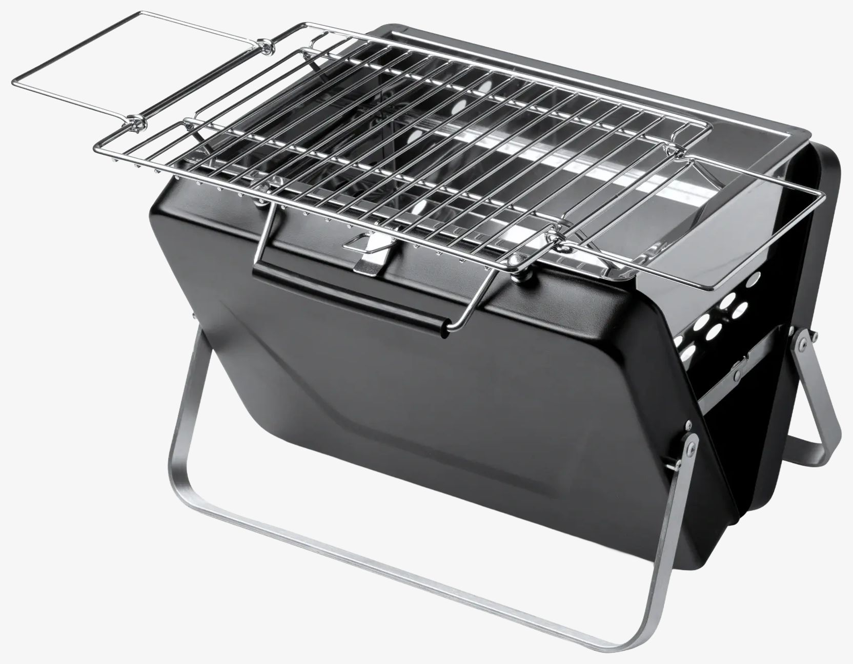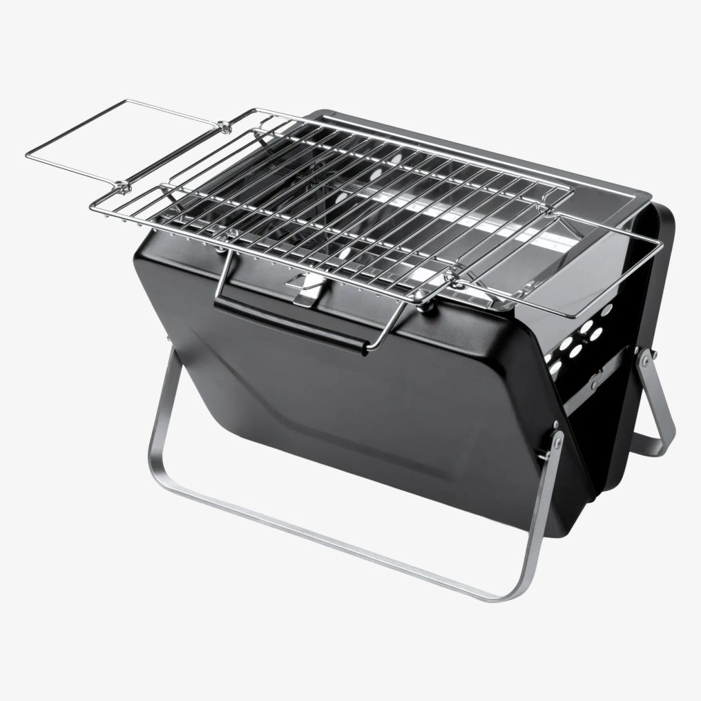 Le barbecue à charbon portable en acier inoxydable se plie pour un format compact semblable à un porte-documents avec un gril pliable. Il est présenté dans une boîte éco-conçue avec poignée de transport.