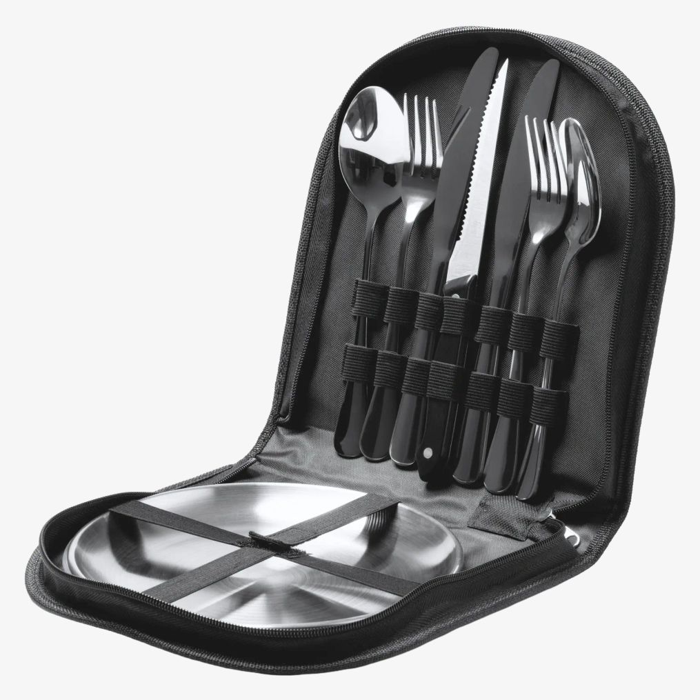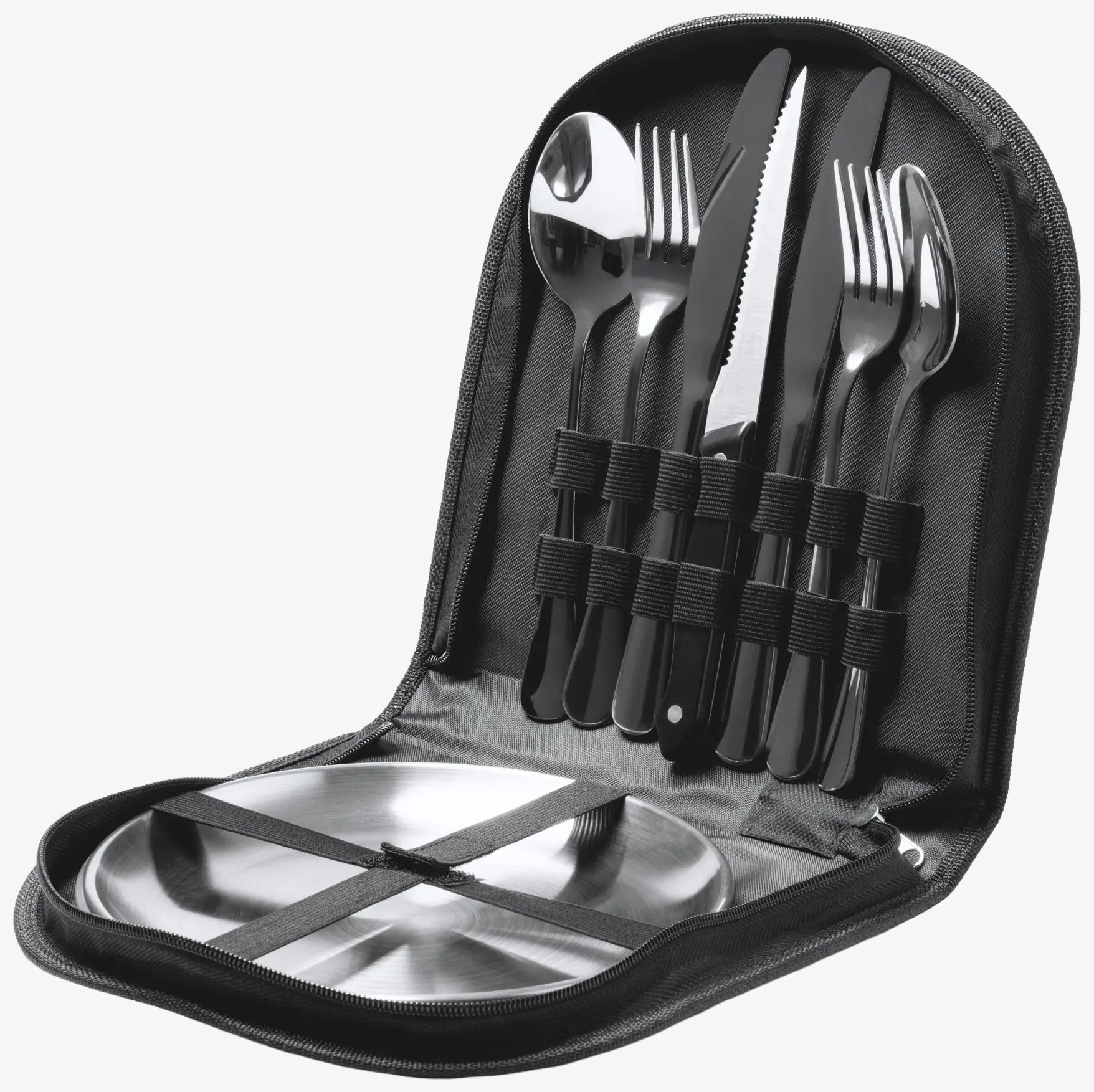 L'ensemble couverts acier inoxydable comprend 2 cuillères, 2 fourchettes, 2 couteaux, un couteau scie et 2 assiettes. L'ensemble est présenté dans un étui RPET avec fermeture zippée pour faciliter le transport.