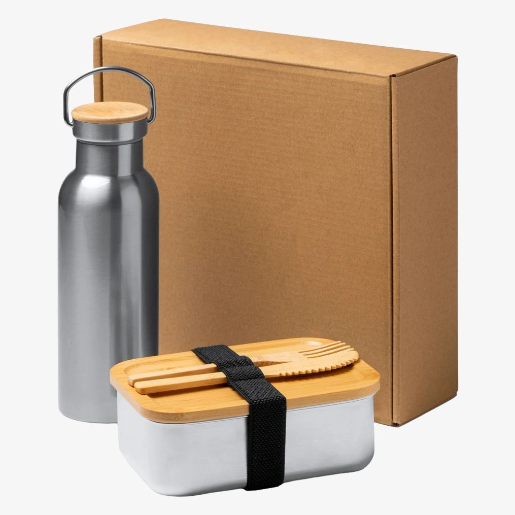L'ensemble gamelle acier comprend une gamelle en acier inoxydable 304 d'une capacité de 800 ml avec couvercle en bambou muni d'une bande élastique de sécurité. Il inclut également un ensemble de couverts en bambou ainsi qu'une bouteille en acier inoxydable 304 d'une capacité de 500 ml.