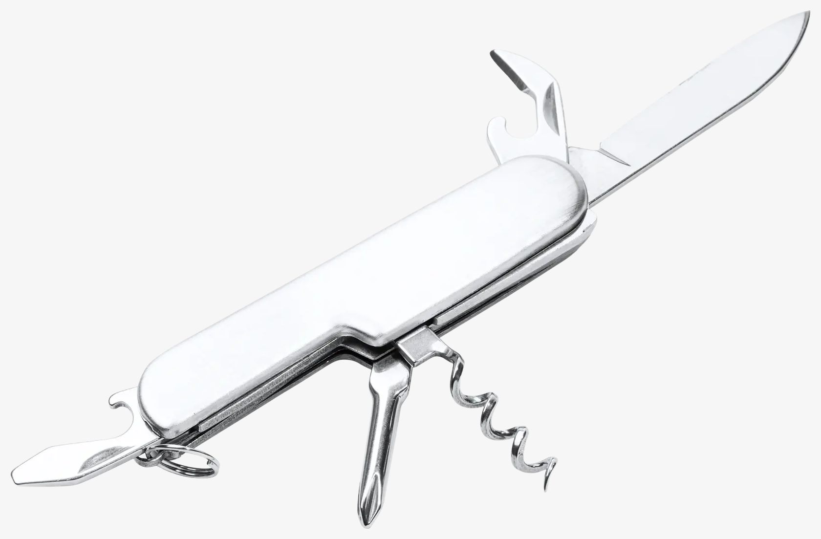 Le couteau suisse ZORA en acier inoxydable rassemble six fonctions : couteau, ouvre-bouteille, ouvre-boîte, tire-bouchon, tournevis et porte-clés. Il mesure 7,6 x 2,1 x 0,7 cm.