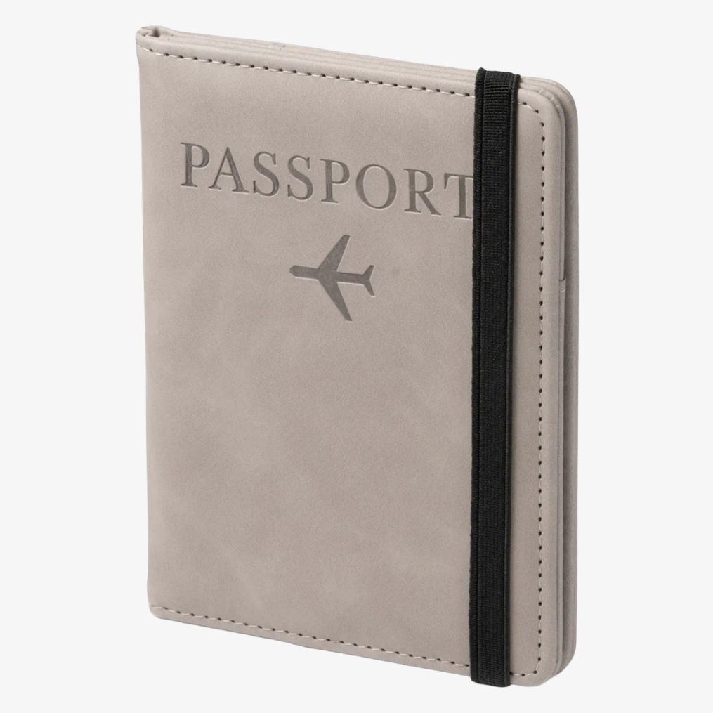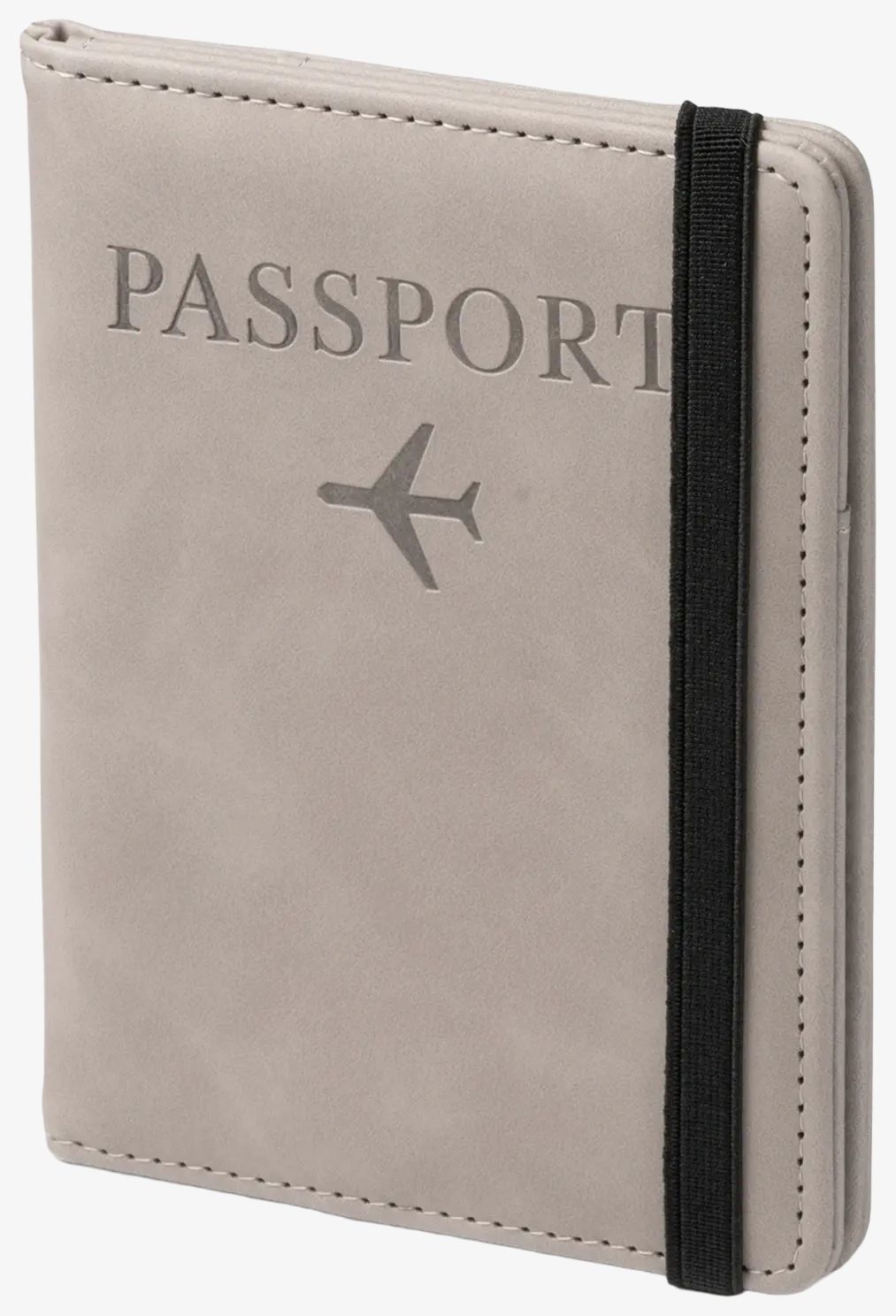 La couverture passeport en polyuréthane comprend une sangle élastique pour la fermeture et plusieurs compartiments pour organiser cartes et documents.