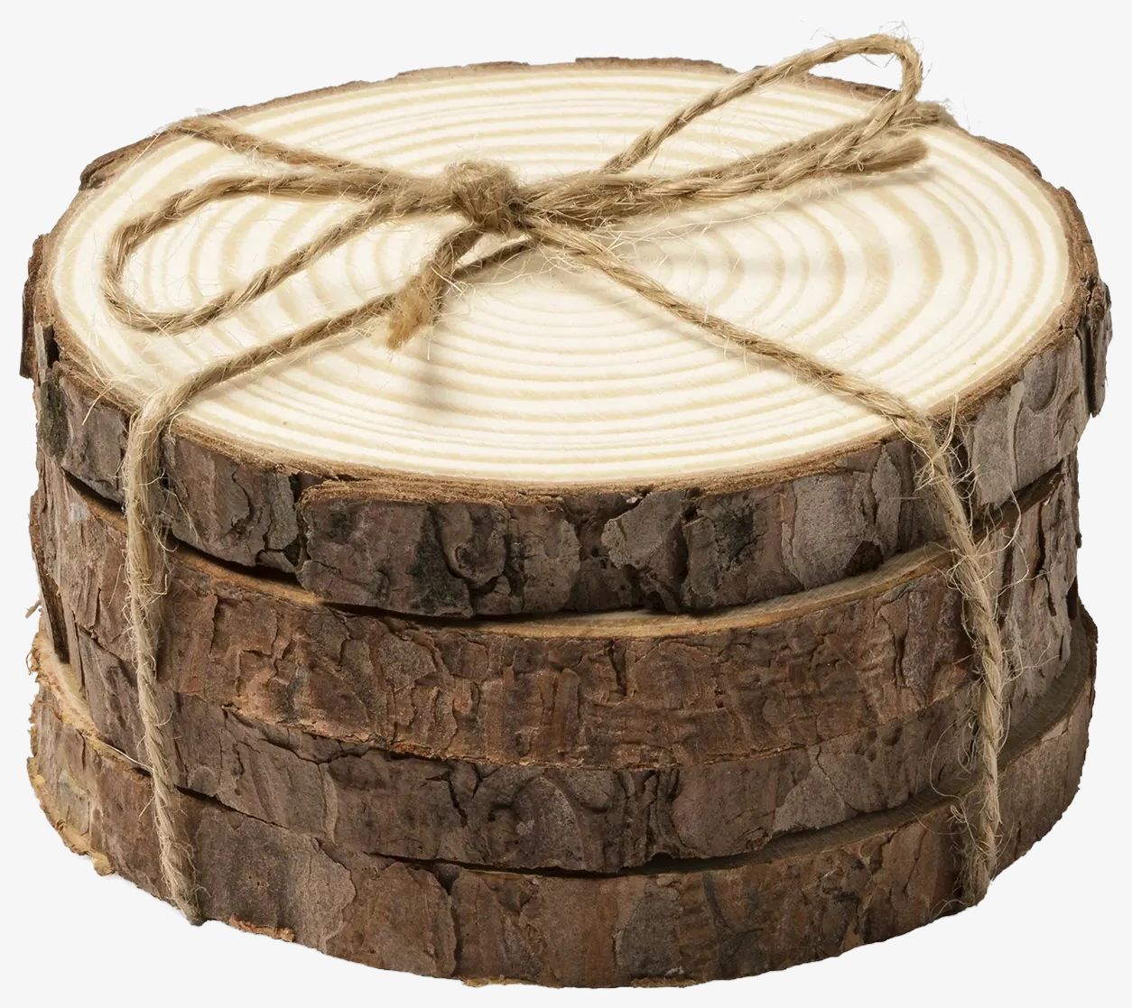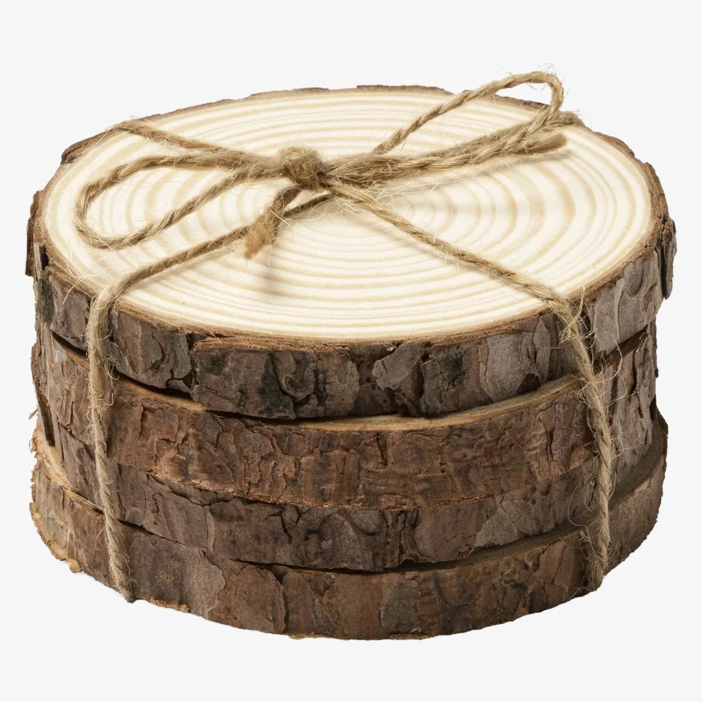 Le service comprend 4 sous-verres en bois de pin naturel présentés avec un cordon en jute dans une boîte éco-conçue.