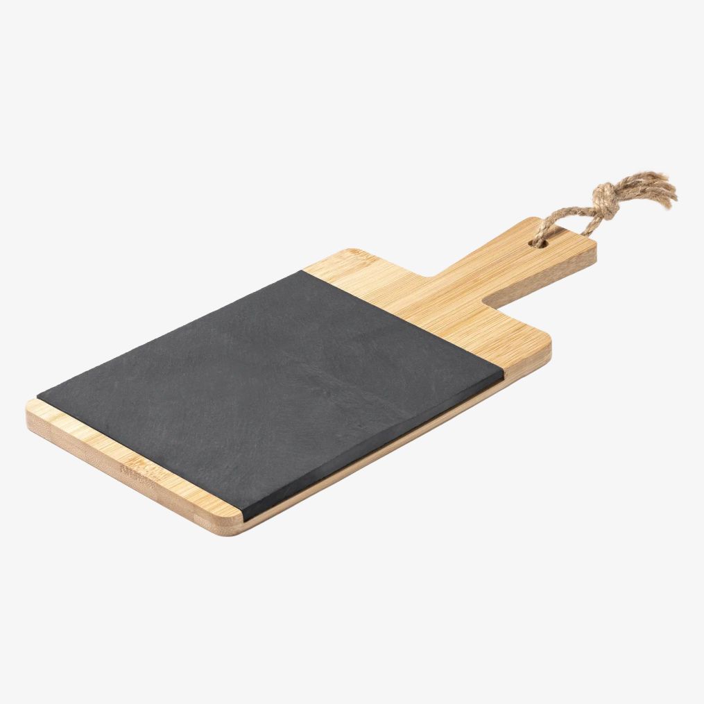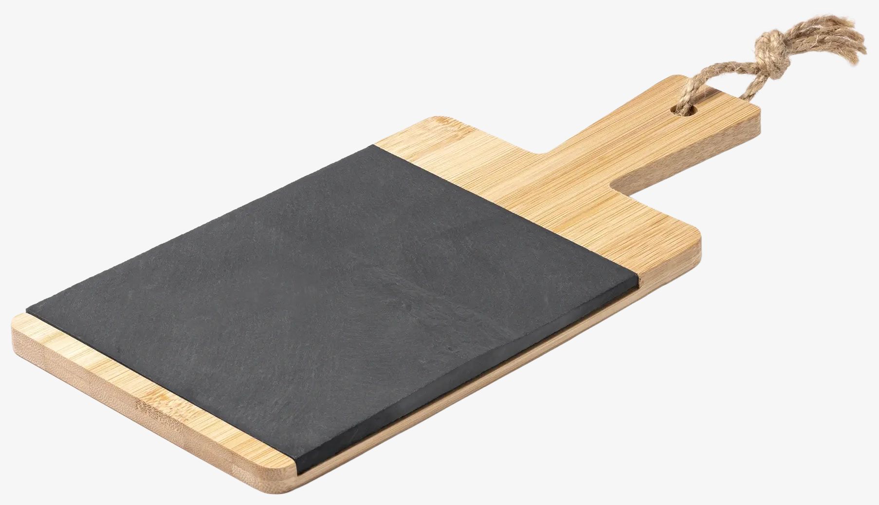 La planche découper bambou CASTEL associe bambou et ardoise dans un design fonctionnel adapté à la cuisine. La surface en bambou offre une zone de coupe durable résistante à l'humidité et aux bactéries. L'ardoise apporte un aspect distinct pour présenter les aliments. Elle dispose d'une poignée ergonomique facilitant la manipulation et d'une corde pour suspension.