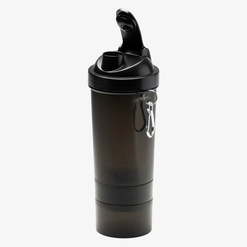 Le shaker est conçu en polypropylène avec un agitateur en acier inoxydable 304 et comprend un distributeur avec compartiments pour les suppléments. Sa capacité est de 600 ml et il est équipé d'un mousqueton.