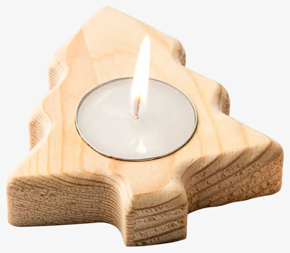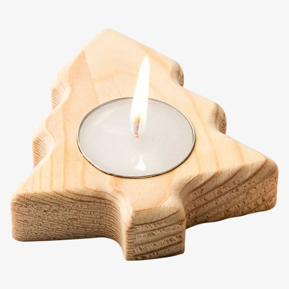 La bougie sur socle bois présente une forme d'arbre décorative avec motifs de Noël. Elle combine paraffine et bois pin pour sa composition.