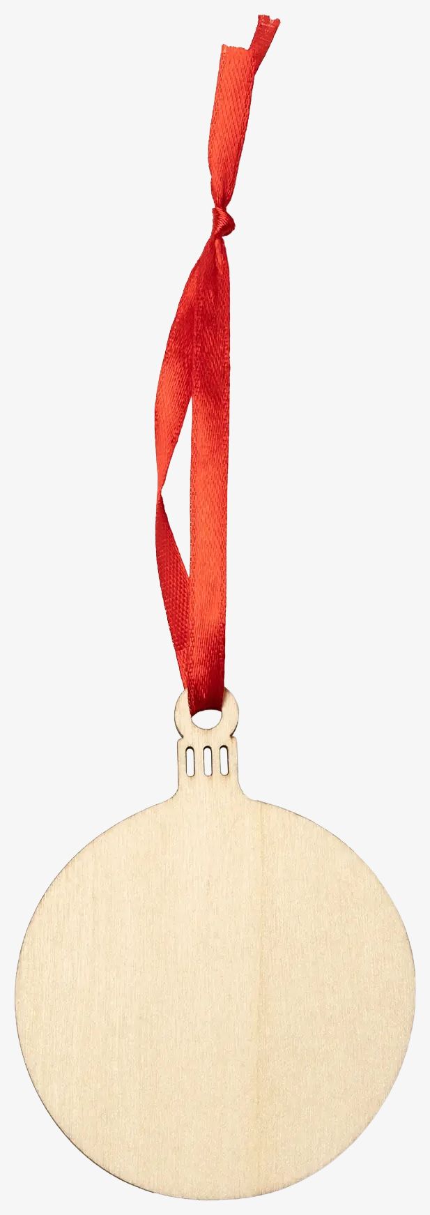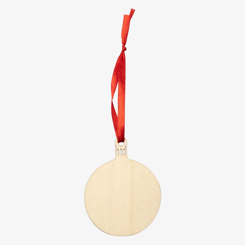 La décoration Noël forme boule est conçue en bois avec une sangle de suspension rouge. Elle combine bois et polyester pour sa fabrication.