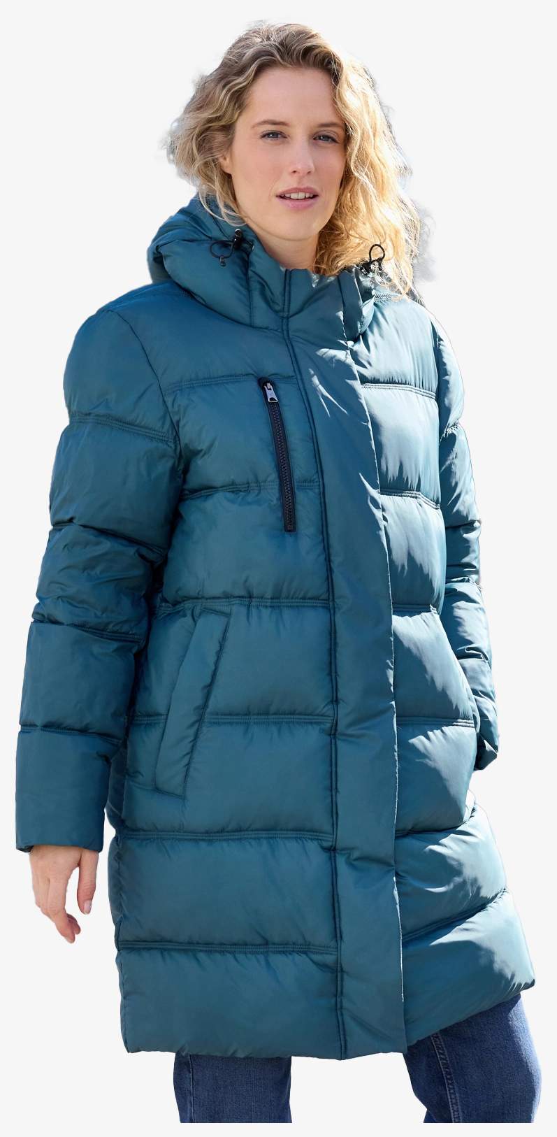 Le manteau d'hiver matelassé en polyester recyclé comprend un rembourrage divisé en grands compartiments. Il comporte une poche poitrine zippée, deux poches latérales zippées, ainsi qu'une fermeture bidirectionnelle sur toute la longueur. La capuche est réglable et les poignets internes sont élastiques.