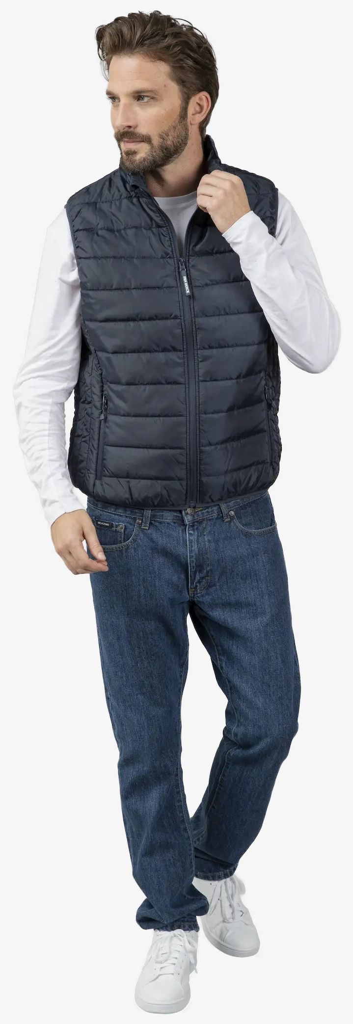 Le bodywarmer pour homme est conçu en polyester recyclé avec une matière matelassée. Il comprend une fermeture zippée avec tirette, des poches latérales à tirettes plastique, un rabat tempête intérieur, une poche intérieure zippée et un protège-menton. Les emmanchures sont équipées de biais élastiqués.