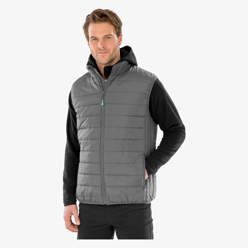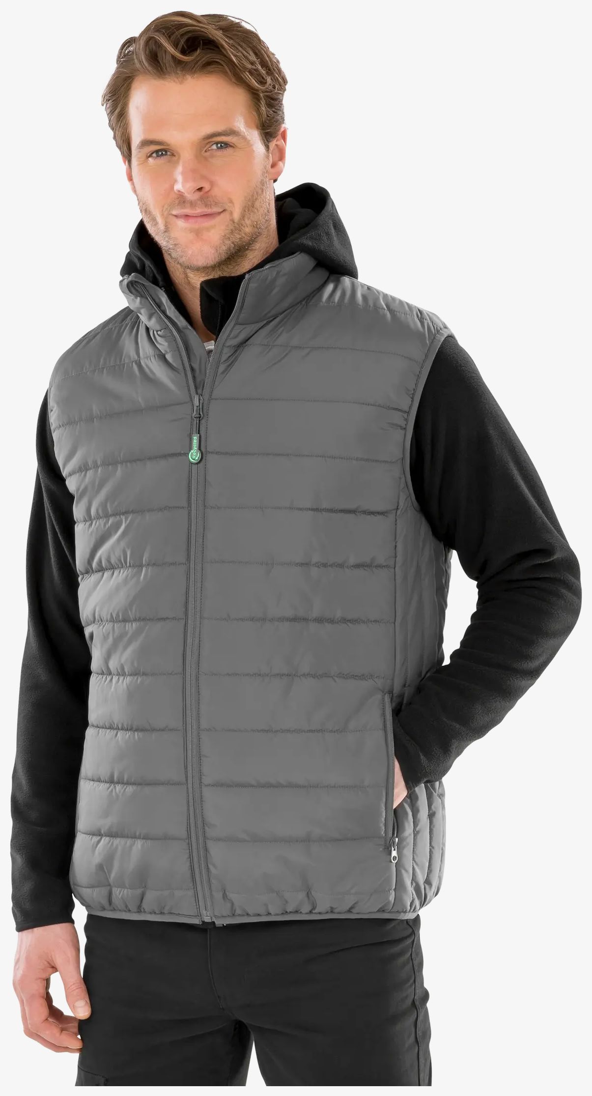 Le Bodywarmer Matelassé Recyclé est un gilet matelassé plus long avec empiècements latéraux verticaux, col montant et poches. La fermeture avant intègre une protection menton. Le tissu recyclé est indiqué comme coupe-vent, respirant et résiste à l'eau.