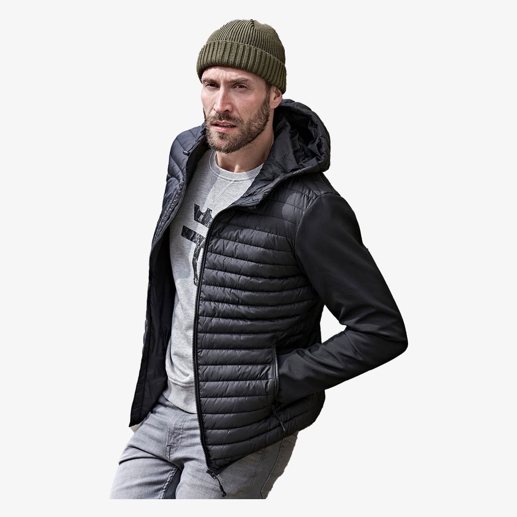 La veste bi-matière homme combine polyester matelassé softshell et polyester 300T avec rembourrage polyester. Elle comprend une capuche ajustable, une poche poitrine zippée, deux grandes poches avant et une poche intérieure. La taille est ajustable et les poignets sont élastiqués.