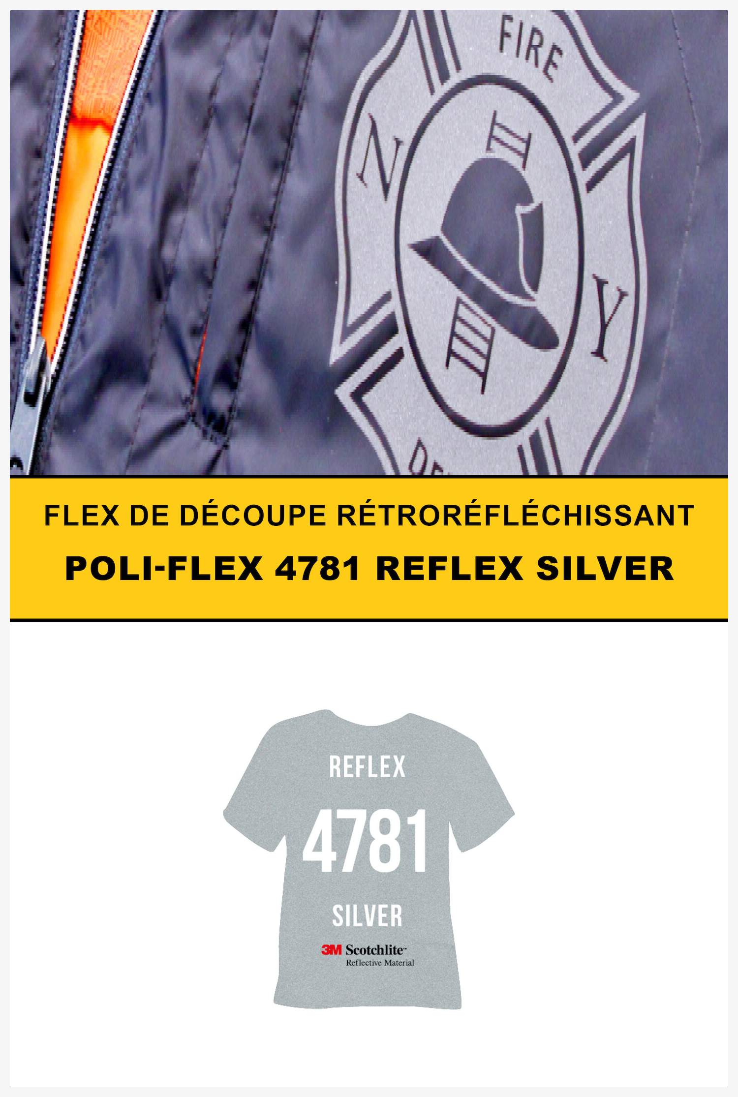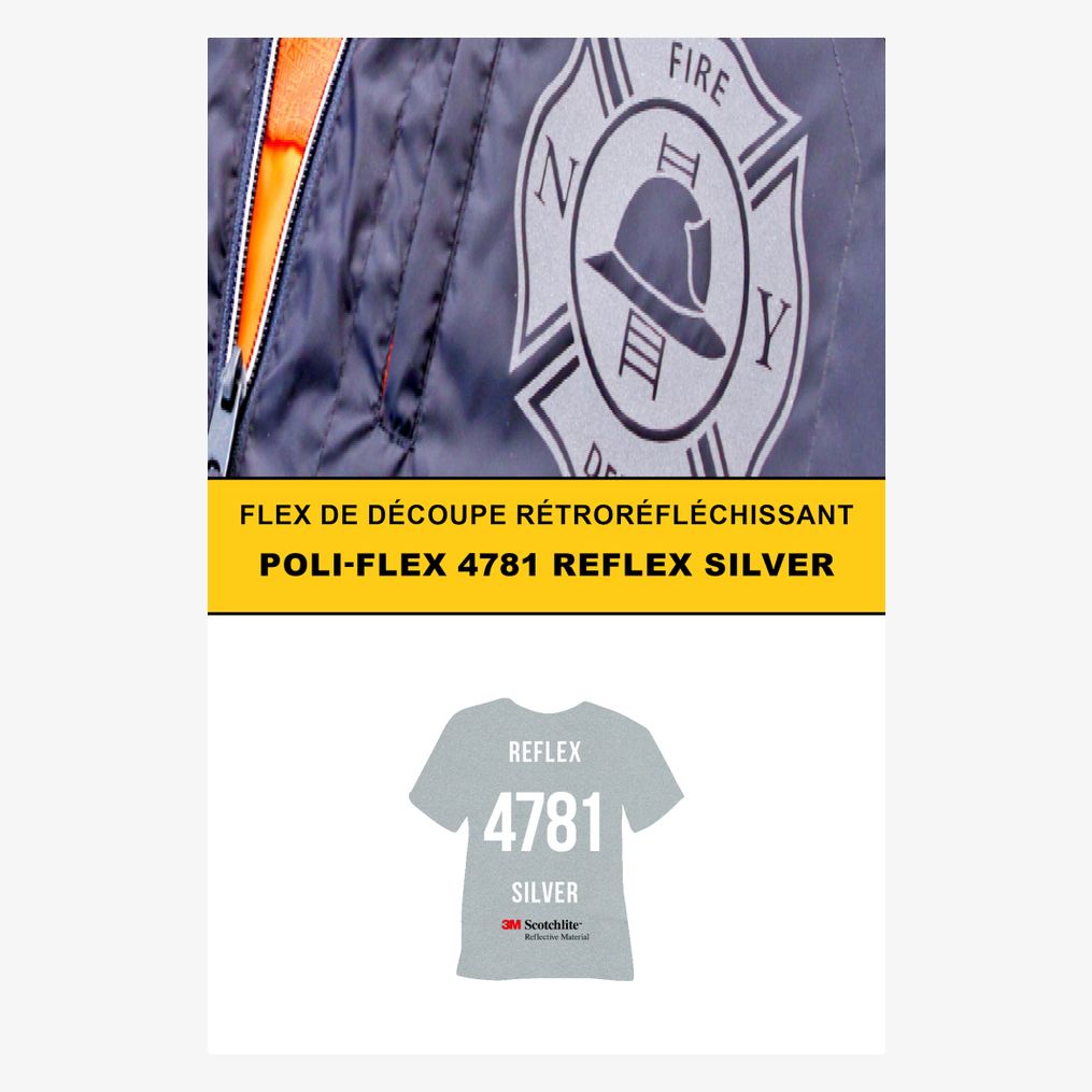 Le Poli-Flex® 4781 est un flex adhésif à effet rétroréfléchissant. Il est composé d'un copolyester collé à chaud avec un revêtement en film PET auto-adhésif. Le transfert s'effectue à 160 °C, sous une pression moyenne de 3,5 bar pendant 15 secondes.