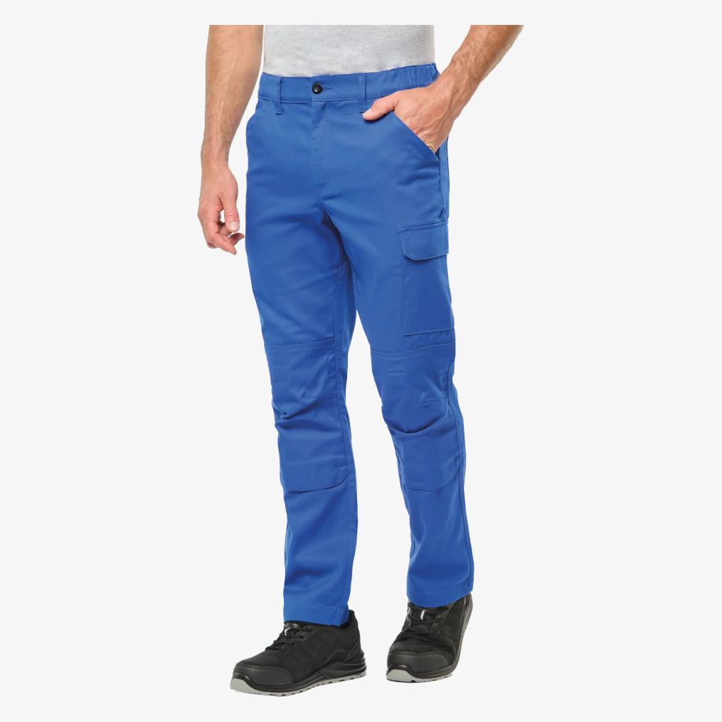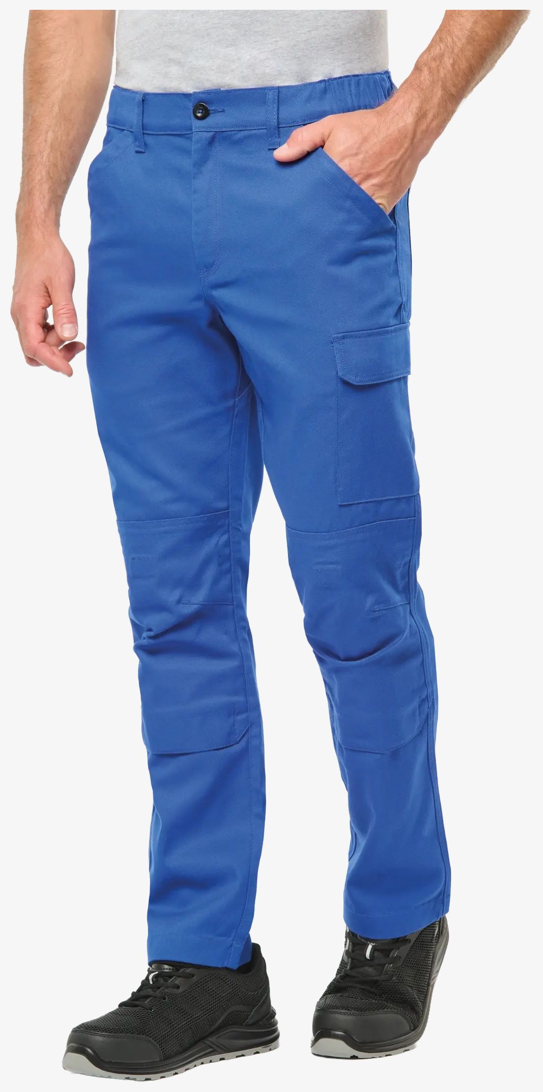 Le pantalon travail multipoches homme combine tissu sergé en polycoton (60% coton, 40% polyester) offrant confort et durabilité. Ce modèle présente une coupe droite avec plusieurs poches fonctionnelles adaptées aux besoins professionnels.