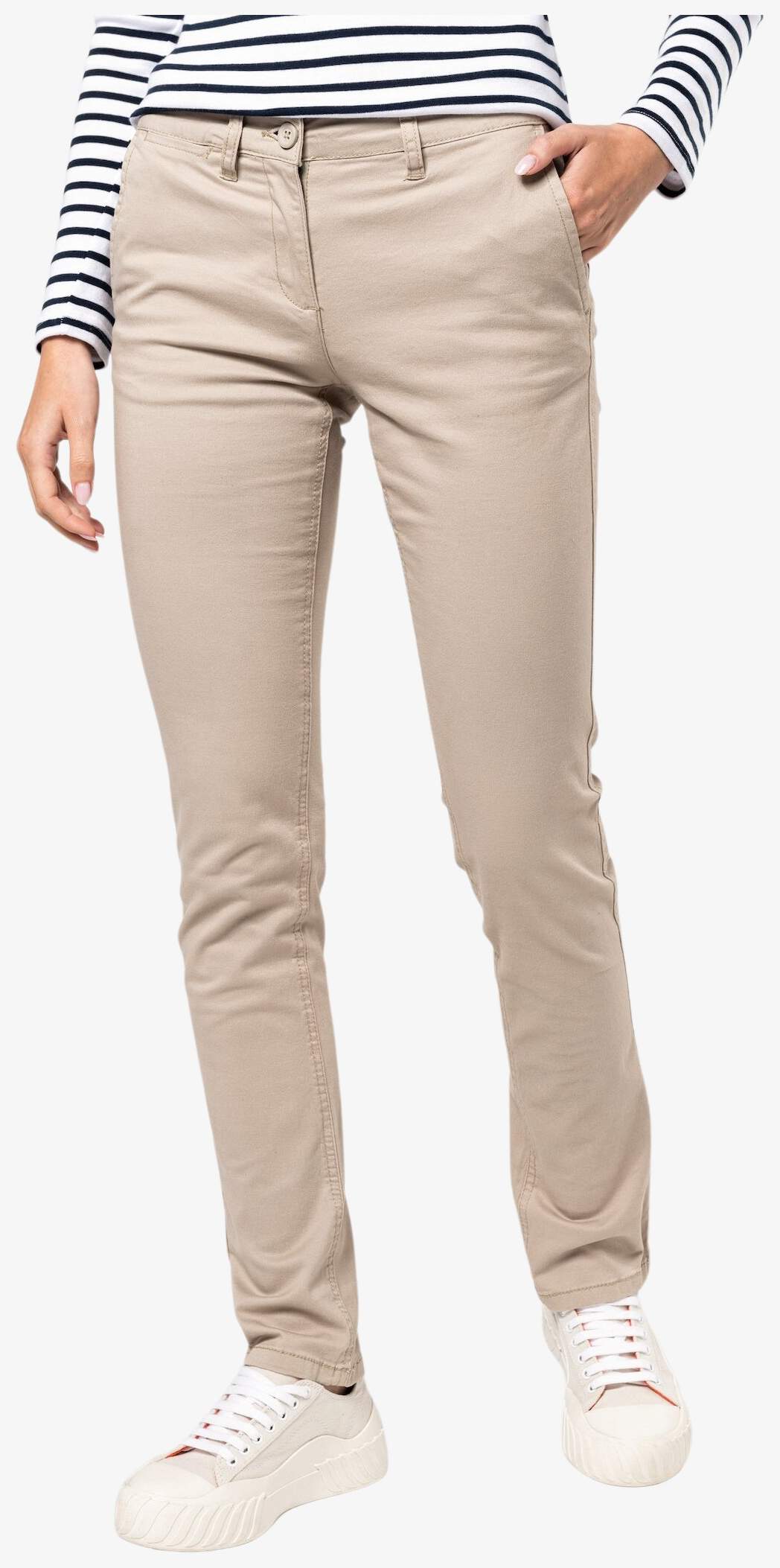 Le pantalon chino femme combine coton sergé et élasthanne pour une texture souple et confortable. Il dispose d'une coupe moderne et de plusieurs poches adaptées à un usage quotidien. Ce modèle a subi un traitement avec un aspect vieilli qui crée des variations de couleur rendant chaque pièce unique.